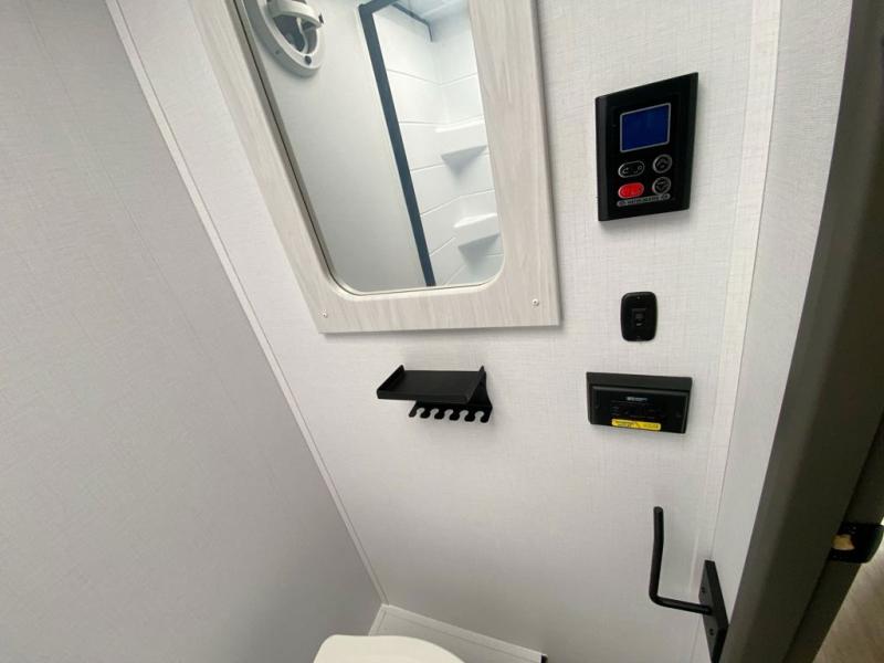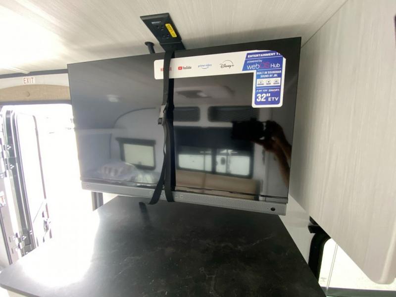 This single axle trailer is both cozy and versatile since there is a fold down sofa/Murphy bed up front! Now you can easily convert seating space into sleeping space, plus there are dual bedside closets to keep your things tidy. A two-burner cooktop and air fryer/convection microwave will let you cook meals each day, and there is a large countertop plus a flip-up extension for even more prep space. This unit also includes theater seating where you can relax each day along with a foldable table to enjoy your meals, and the fireplace is sure to make your space feel like home!