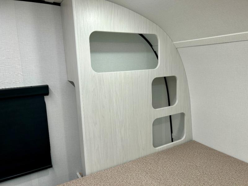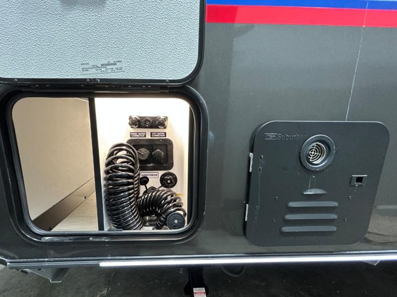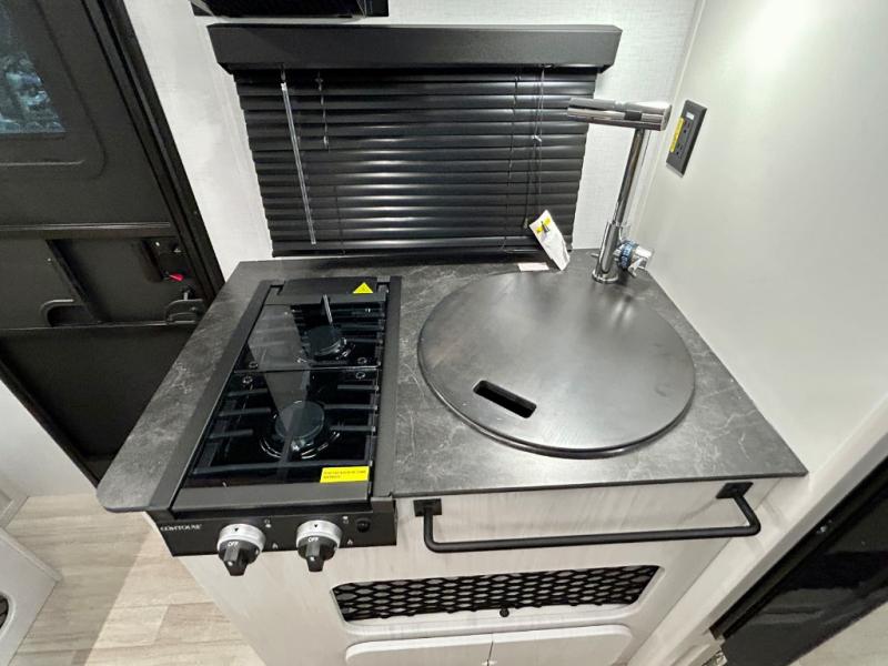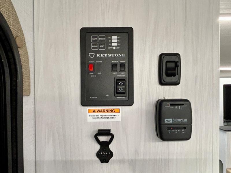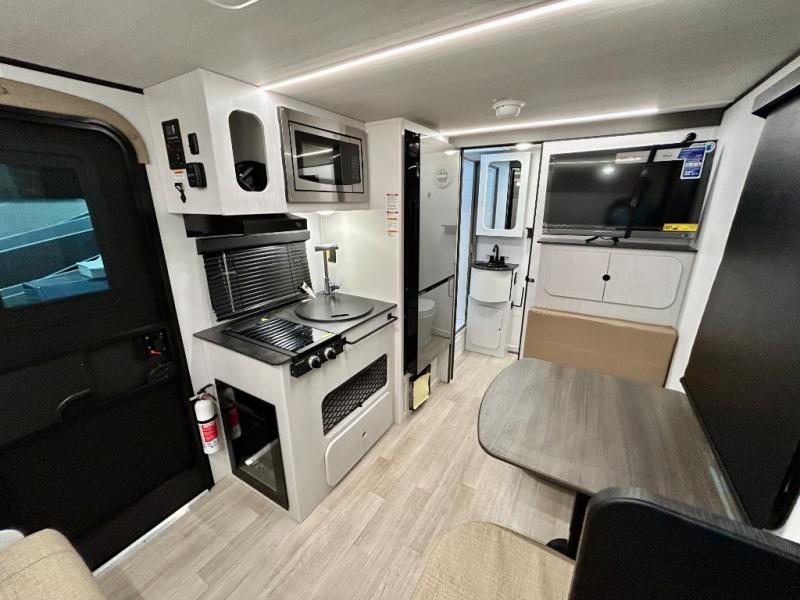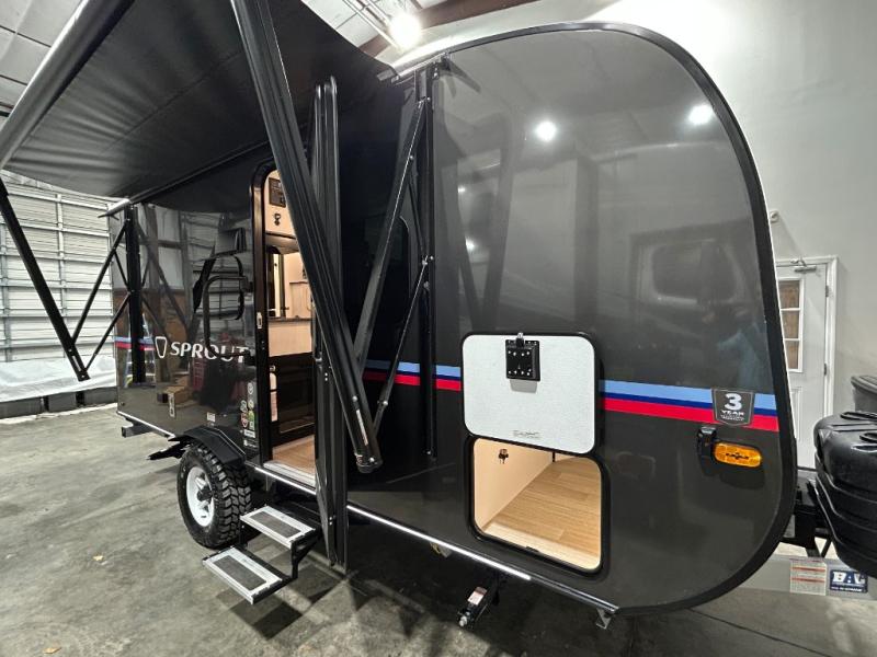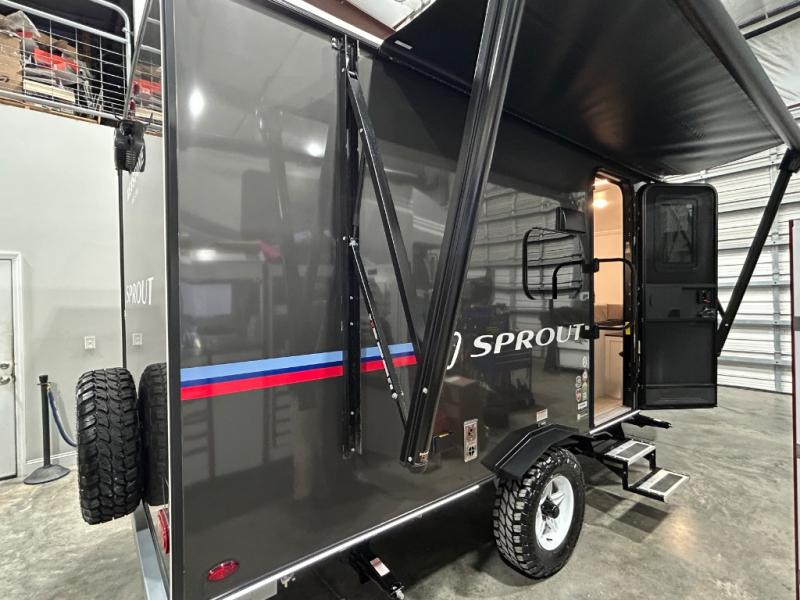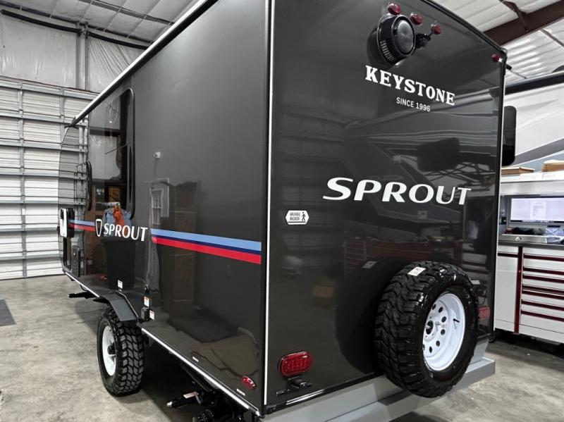 The Sprout travel trailers by Keystone are premium single-axle units that are sure to make an impression at the campground. Each one is built with .040 smooth front medal, one piece heated and enclosed underbelly, power tongue jack. There are also tinted safety glass windows, quick drop stabilizer jacks, and an exterior shower with hot and cold water. Inside, you will enjoy blackout night shades and a 78" interior height, along with an ultra-bright LED light strip and solid surface countertops in the kitchen. The 13,500 BTU A/C and 20,000 BTU furnace will keep you comfortable, and the Suburban tankless water heater is a convenience you won't want to camp without!