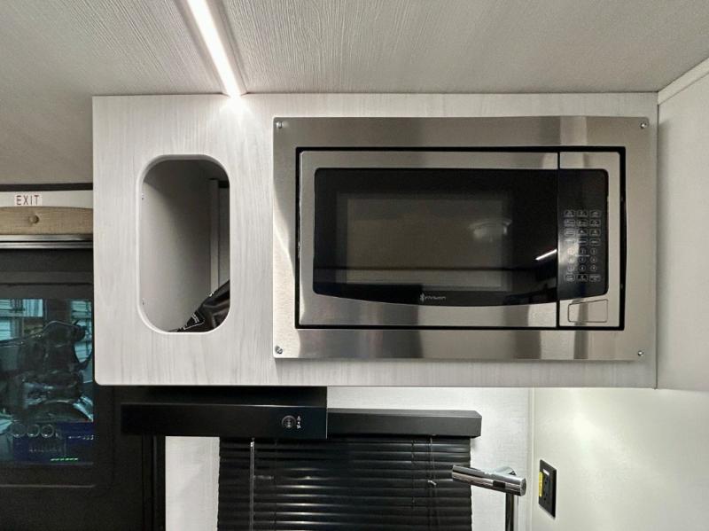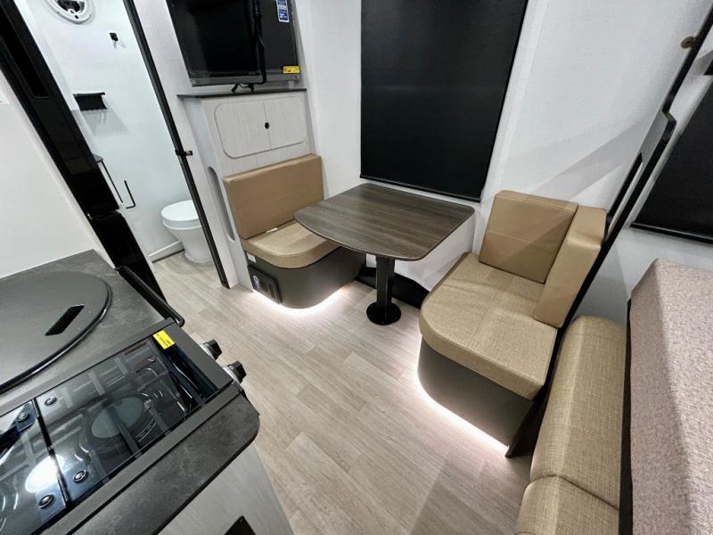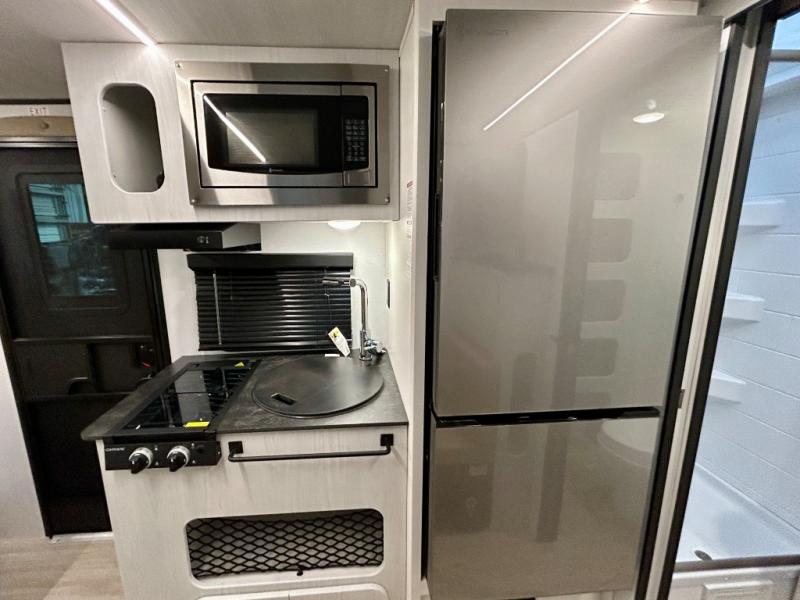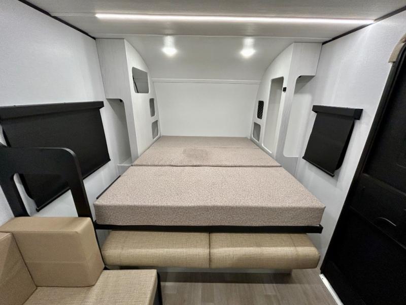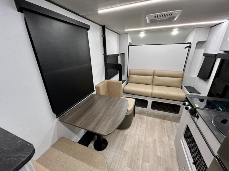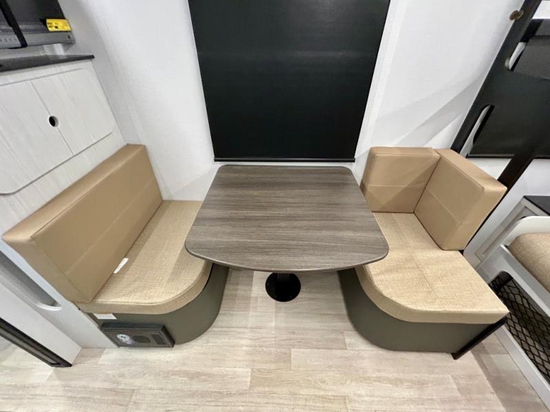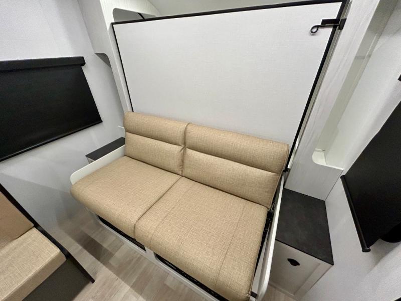 This single axle trailer is both cozy and versatile since there is a fold down sofa/Murphy bed up front! Now you can easily convert seating space into sleeping space, plus there are dual bedside closets to keep your things tidy. A two-burner cooktop and air fryer/convection microwave will let you cook meals each day, and a booth dinette provides a place to dine together. You can also choose to add the optional flip-up bunk above the dinette if you need more sleeping space. And don't overlook the full rear bath that will allow you to freshen up without having to leave your camper!