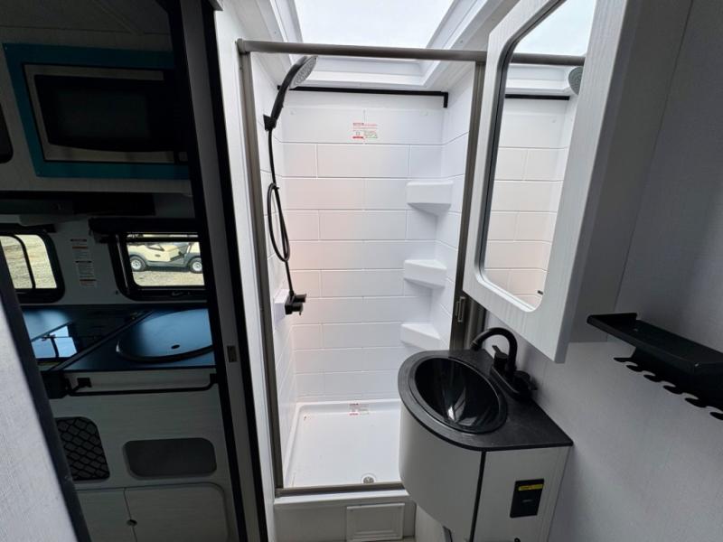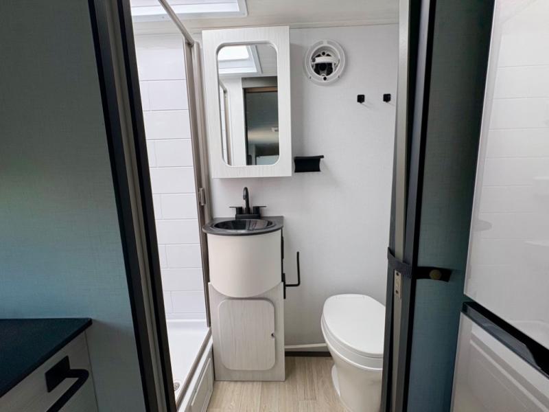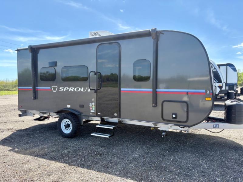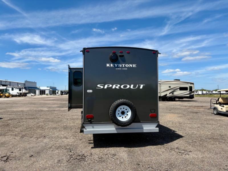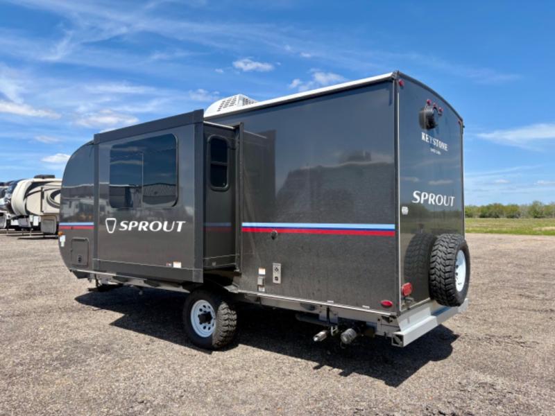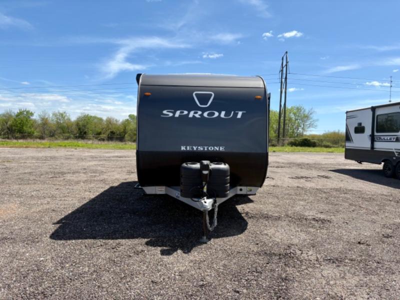 The Sprout travel trailers by Keystone are premium single-axle units that are sure to make an impression at the campground. Each one is built with .040 smooth front medal, one piece heated and enclosed underbelly, power tongue jack. There are also tinted safety glass windows, quick drop stabilizer jacks, and an exterior shower with hot and cold water. Inside, you will enjoy blackout night shades and a 78" interior height, along with an ultra-bright LED light strip and solid surface countertops in the kitchen. The 13,500 BTU A/C and 20,000 BTU furnace will keep you comfortable, and the Suburban tankless water heater is a convenience you won't want to camp without!