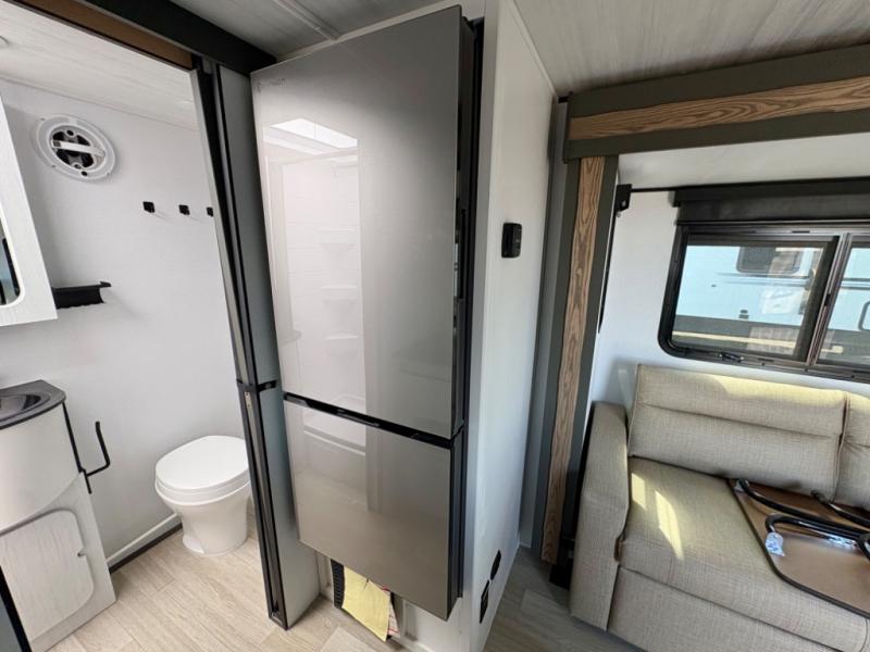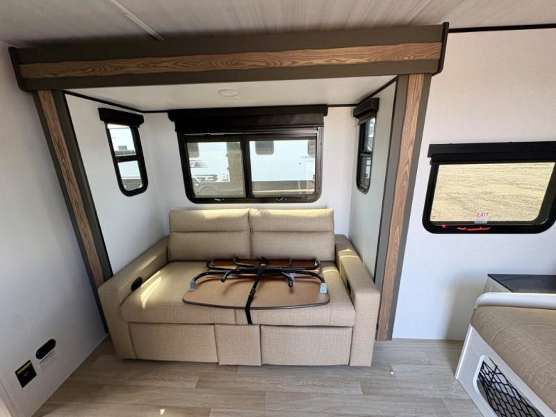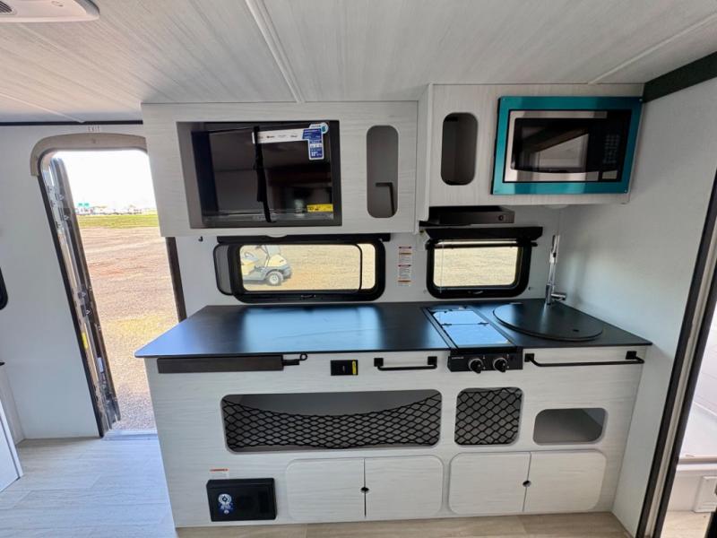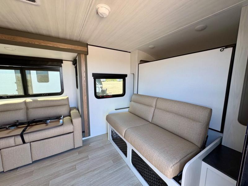 This single axle trailer is both cozy and versatile since there is a fold down sofa/Murphy bed up front! Now you can easily convert seating space into sleeping space, plus there are dual bedside closets to keep your things tidy. A two-burner cooktop and air fryer/convection microwave will let you cook meals each day, and there is a large countertop plus a flip-up extension for even more prep space. This unit also includes theater seating where you can relax each day along with a foldable table to enjoy your meals, and the fireplace is sure to make your space feel like home!