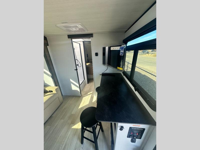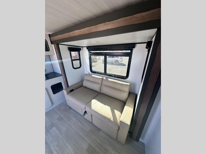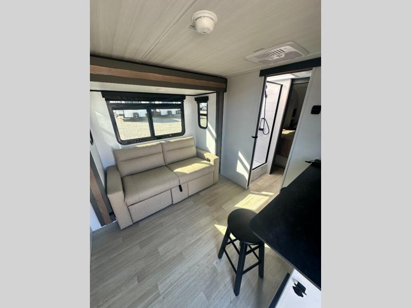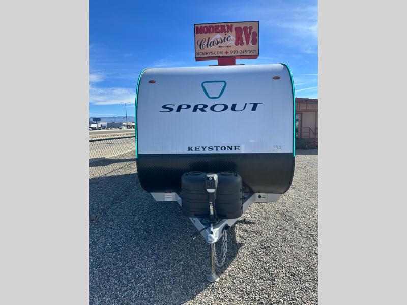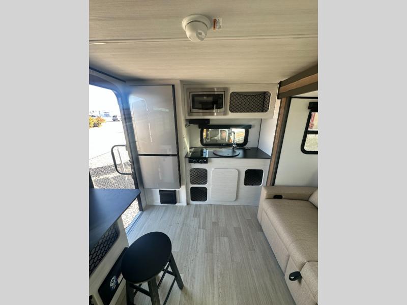 The 2026 Keystone Sprout 19RKS is a lightweight yet feature-packed travel trailer designed for couples or solo travelers seeking comfort and convenience in a compact footprint. With a rear kitchen layout featuring solid-surface countertops, stainless steel sink, and ample window space, it offers a premium cooking experience. The open floorplan includes a walk-around queen bed, central bathroom, and slide-out theater seating, all within a dry weight of around 4,045 lbs and a GVWR of 5,500 lbs. It boasts a 13,500 BTU A/C, 20,000 BTU furnace, enclosed underbelly, pass-through storage, and a power awning for extended outdoor living. Holding tanks include a 37-gallon fresh water, 54-gallon gray, and 27-gallon black. Additional highlights include upgraded USB-A & C ports, LED lighting, LP quick-connect, and Keystone’s 1-year limited and 3-year structural warranties, making it an excellent choice for year-round adventure without sacrificing quality or towability.