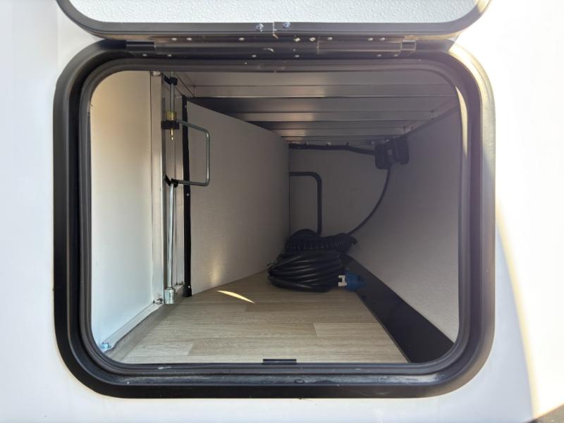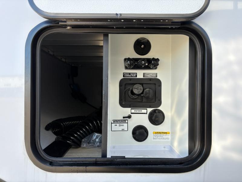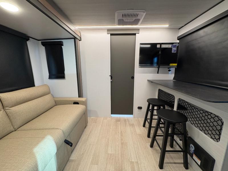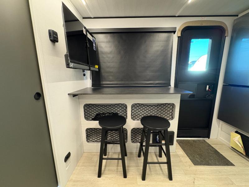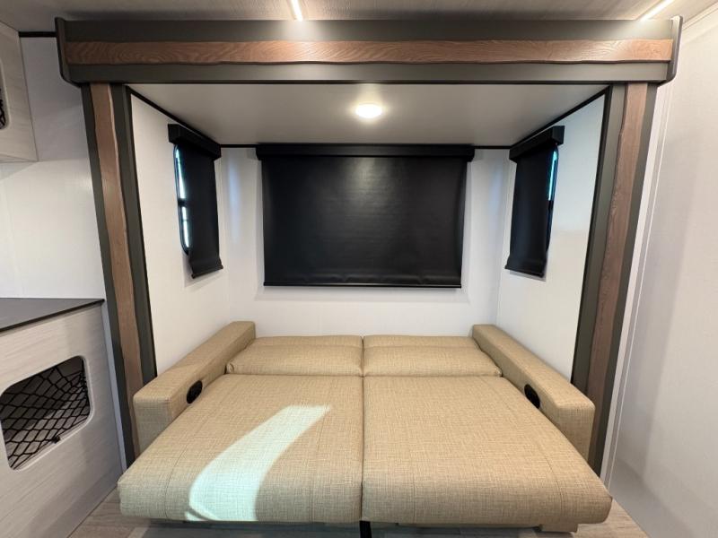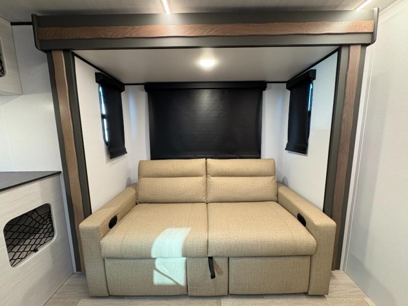 At the front of this travel trailer, you’ll find a spacious bedroom featuring a walk-around RV queen bed, there are closets on each side to store your clothes and essentials. Moving toward the center, the thoughtfully designed walk-through bathroom includes a shower, toilet, and a hidden vanity that not only helps you get ready but also maximizes space efficiency. The living area offers theater seating on the slide-out, providing a comfortable place to relax, while directly across is a cozy breakfast nook perfect for enjoying meals. At the rear, the fully equipped kitchen includes a sink, a two-burner range, and a generous 11-cubic-foot refrigerator offering all the space you need to store your favorite ingredients and cook delicious meals on the go.