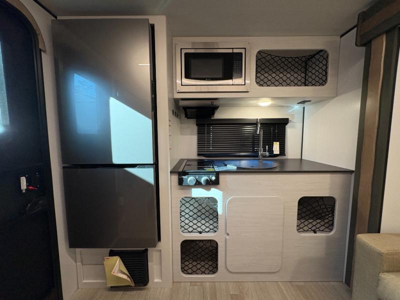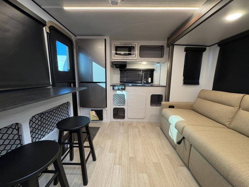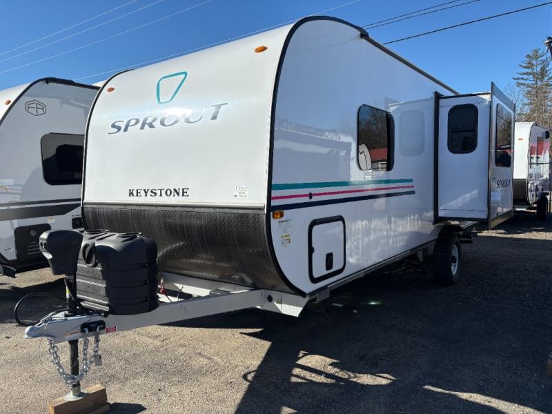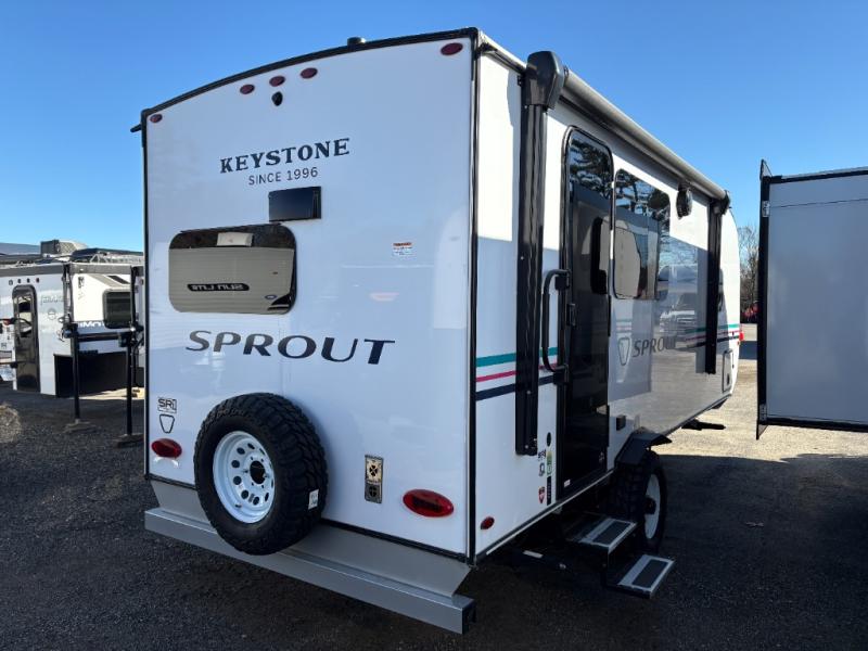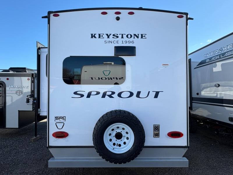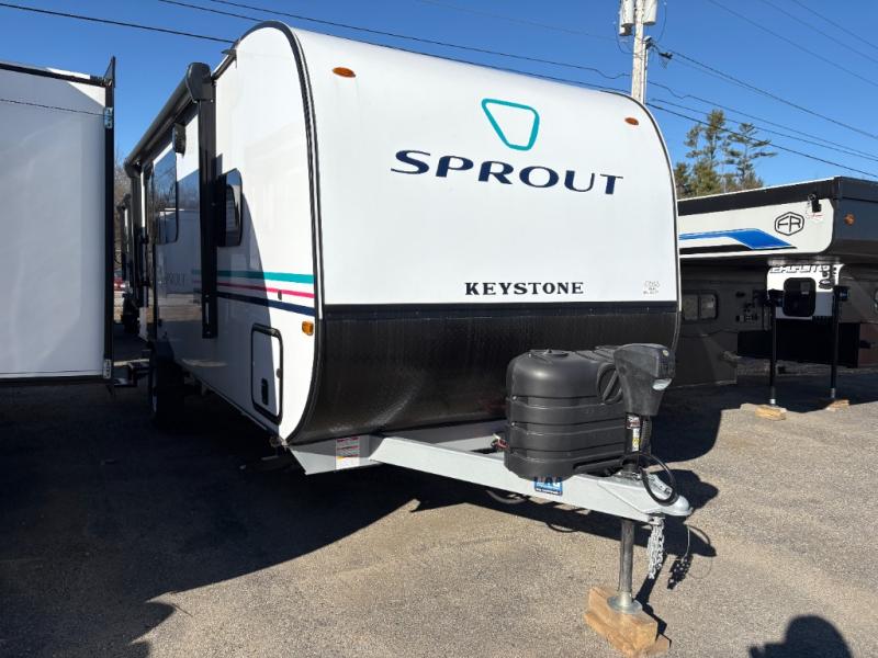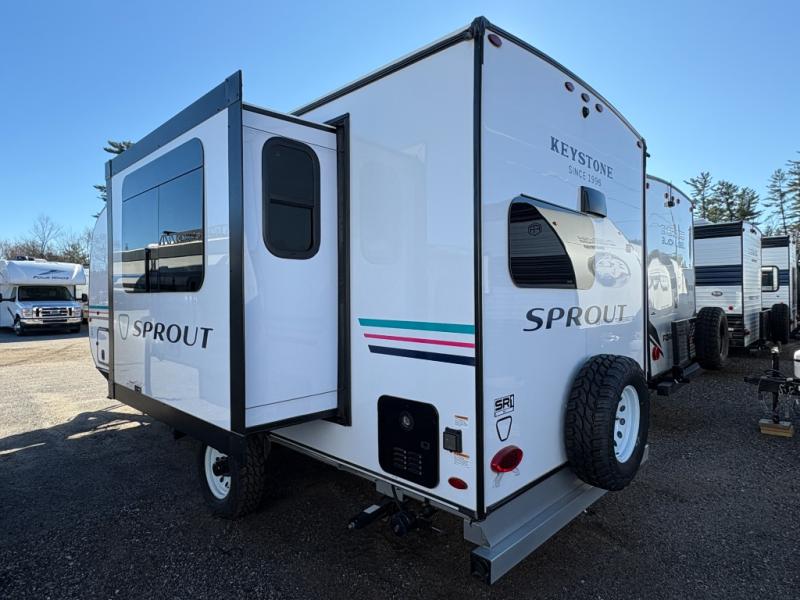 The Sprout travel trailers by Keystone are premium single-axle units that are sure to make an impression at the campground. Each one is built with .040 smooth front medal, one piece heated and enclosed underbelly, power tongue jack. There are also tinted safety glass windows, quick drop stabilizer jacks, and an exterior shower with hot and cold water. Inside, you will enjoy blackout night shades and a 78" interior height, along with an ultra-bright LED light strip and solid surface countertops in the kitchen. The 13,500 BTU A/C and 20,000 BTU furnace will keep you comfortable, and the Suburban tankless water heater is a convenience you won't want to camp without!