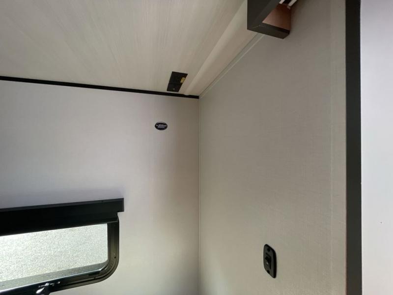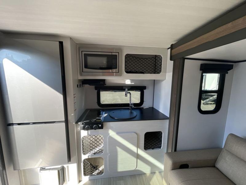 The Sprout travel trailers by Keystone are premium single-axle units that are sure to make an impression at the campground. Each one is built with .040 smooth front medal, one piece heated and enclosed underbelly, power tongue jack. There are also tinted safety glass windows, quick drop stabilizer jacks, and an exterior shower with hot and cold water. Inside, you will enjoy blackout night shades and a 78" interior height, along with an ultra-bright LED light strip and solid surface countertops in the kitchen. The 13,500 BTU A/C and 20,000 BTU furnace will keep you comfortable, and the Suburban tankless water heater is a convenience you won't want to camp without!