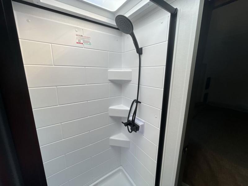 At the front of this travel trailer, you’ll find a spacious bedroom featuring a walk-around RV queen bed, there are closets on each side to store your clothes and essentials. Moving toward the center, the thoughtfully designed walk-through bathroom includes a shower, toilet, and a hidden vanity that not only helps you get ready but also maximizes space efficiency. The living area offers theater seating on the slide-out, providing a comfortable place to relax, while directly across is a cozy breakfast nook perfect for enjoying meals. At the rear, the fully equipped kitchen includes a sink, a two-burner range, and a generous 11-cubic-foot refrigerator offering all the space you need to store your favorite ingredients and cook delicious meals on the go.