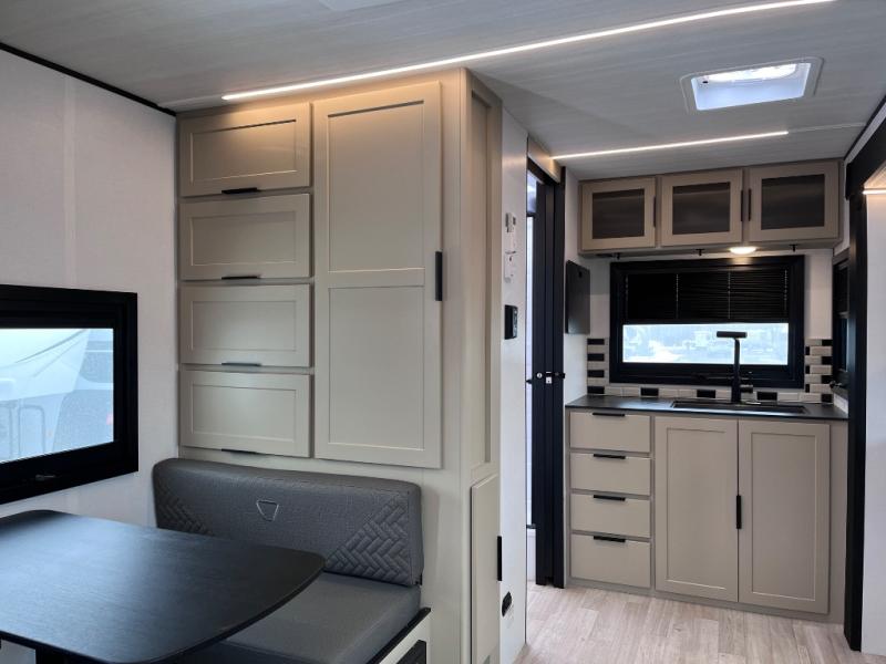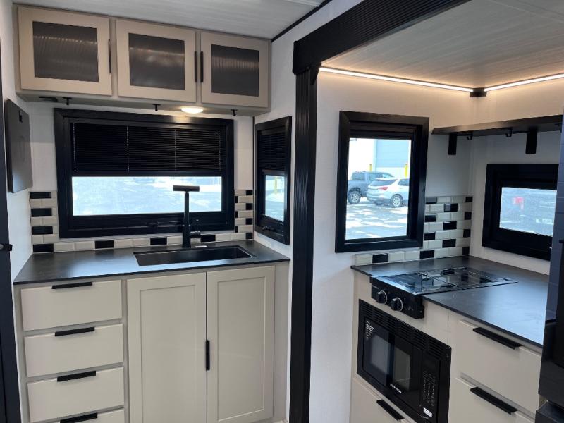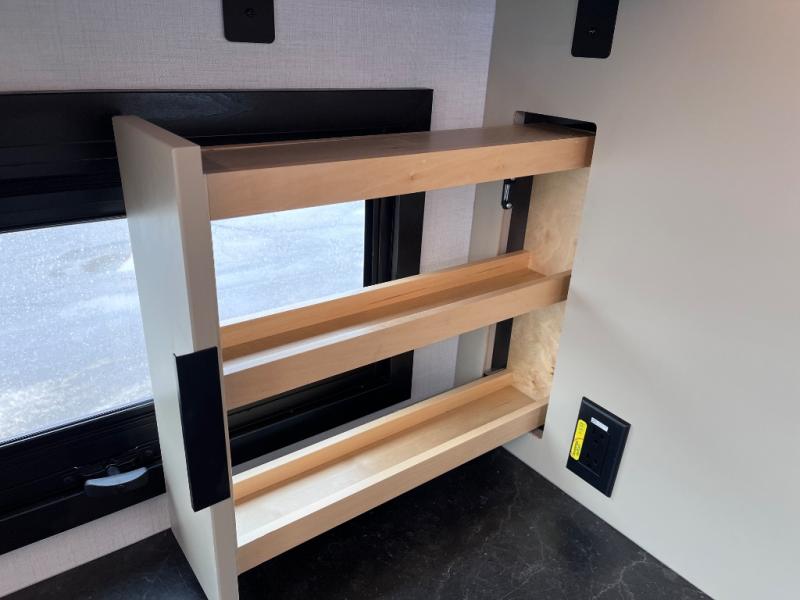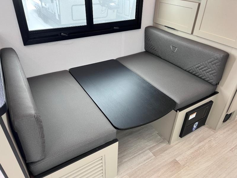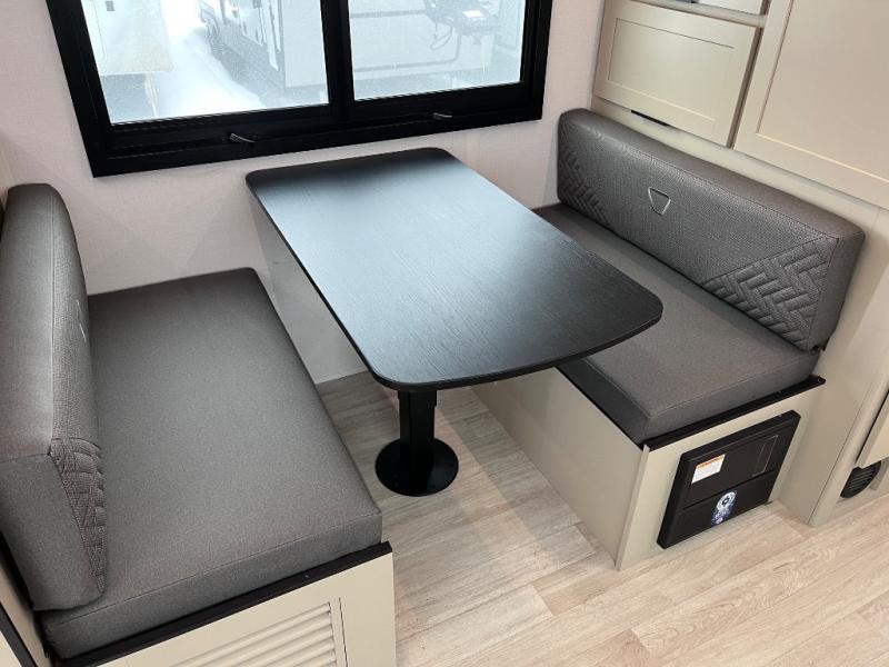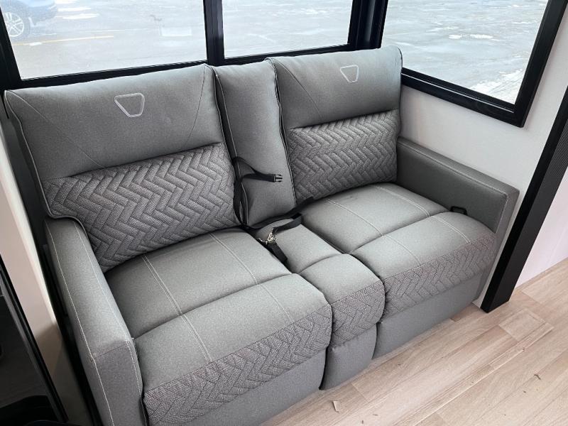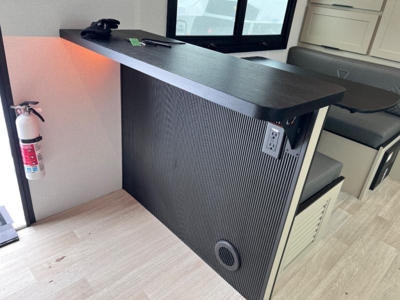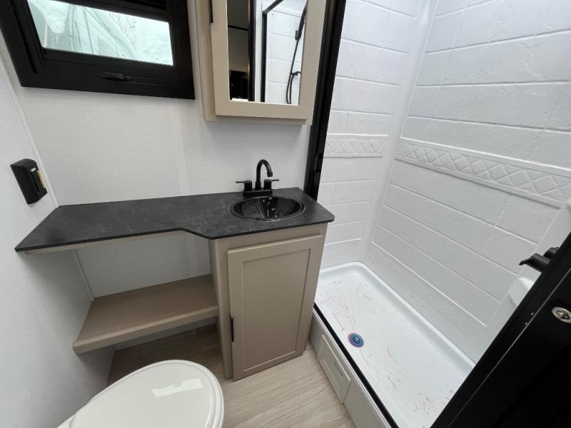 You and your spouse will love this travel trailer’s plush dream day bed with a comfortable bamboo mattress. Ample storage is provided by the wardrobes on each side of the bed, keeping your favorite outfits within easy reach. The booth dinette and theater seating provide perfect spots to enjoy meals, play games, or relax with loved ones. Plus, the layout is designed to maximize comfort and conversation. Whip up meals and snacks with ease and enjoy the convenience of having everything you need in one place since the kitchen is equipped with essentials, including a refrigerator, microwave, and pull-out pantry. Also, the full bathroom provides a convenient private space to get ready for the day.