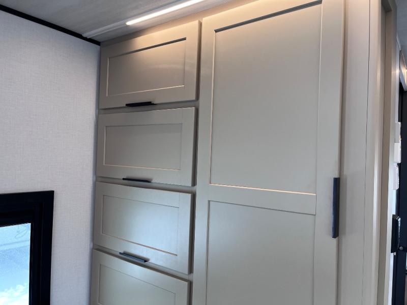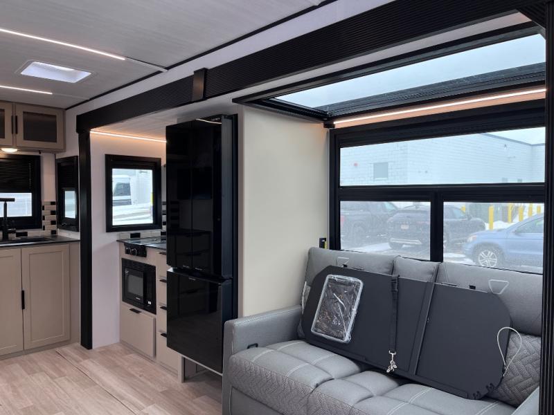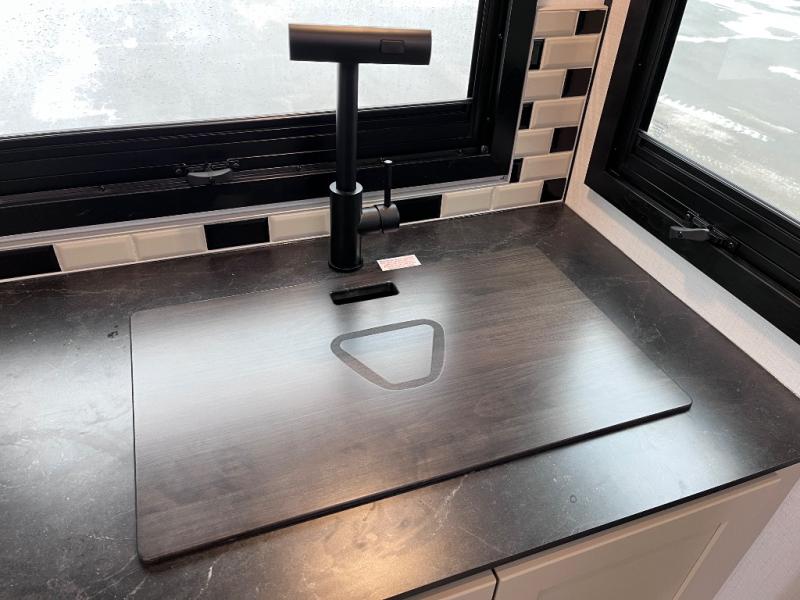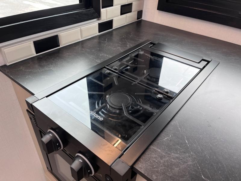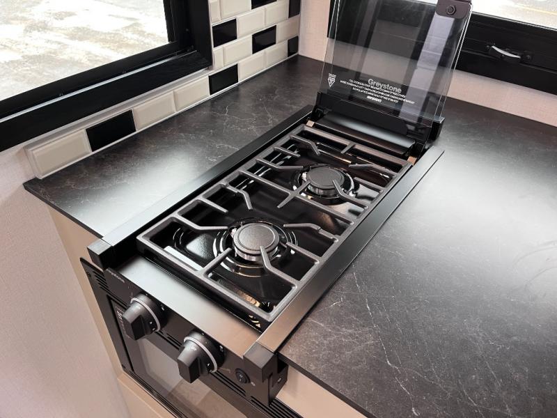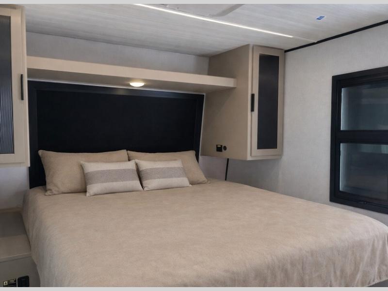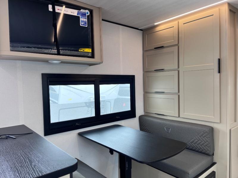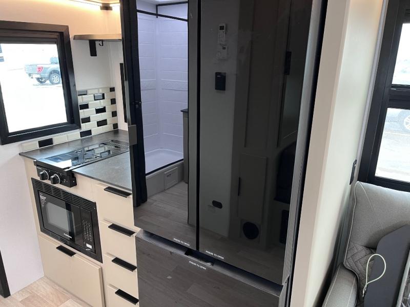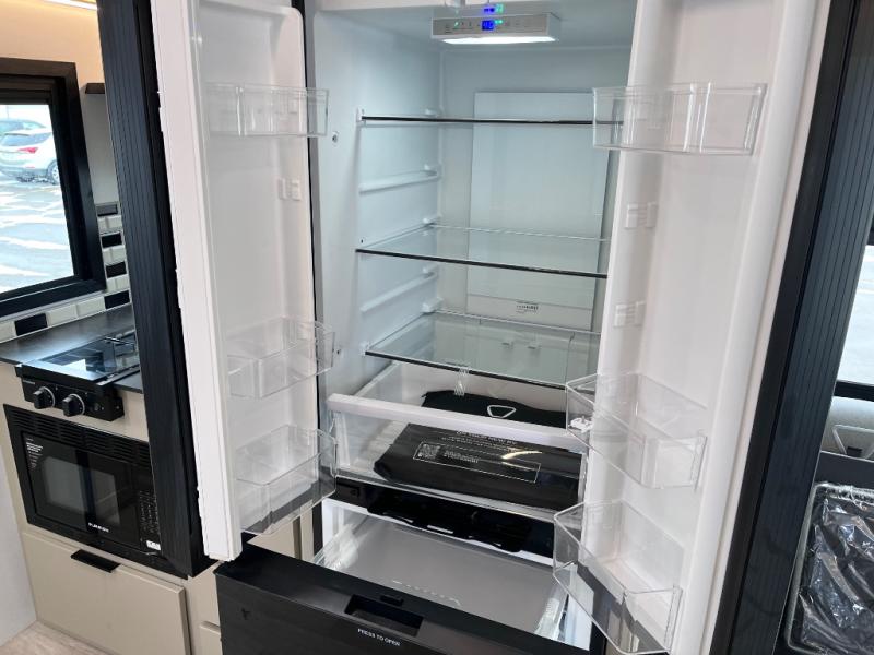 You and your spouse will love this travel trailer’s plush dream day bed with a comfortable bamboo mattress. Ample storage is provided by the wardrobes on each side of the bed, keeping your favorite outfits within easy reach. The booth dinette and theater seating provide perfect spots to enjoy meals, play games, or relax with loved ones. Plus, the layout is designed to maximize comfort and conversation. Whip up meals and snacks with ease and enjoy the convenience of having everything you need in one place since the kitchen is equipped with essentials, including a refrigerator, microwave, and pull-out pantry. Also, the full bathroom provides a convenient private space to get ready for the day.
