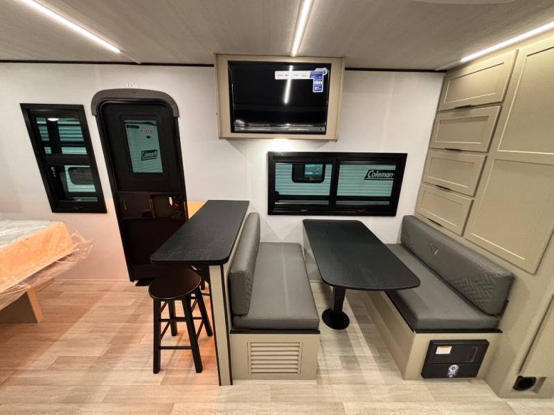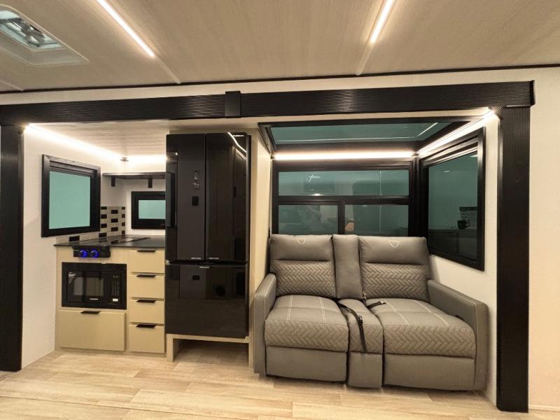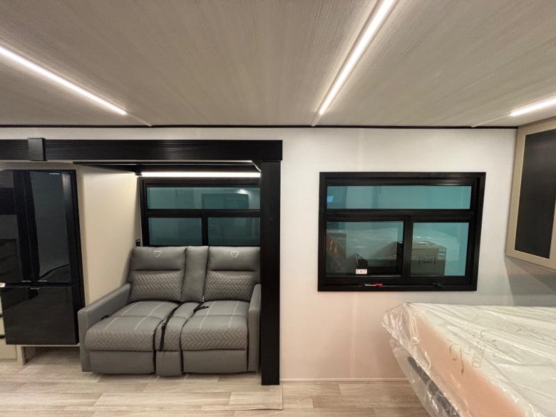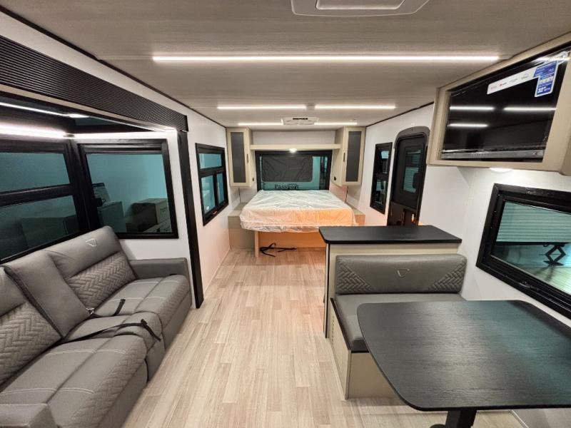 You and your spouse will love this travel trailer’s plush dream day bed with a comfortable bamboo mattress. Ample storage is provided by the wardrobes on each side of the bed, keeping your favorite outfits within easy reach. The booth dinette and theater seating provide perfect spots to enjoy meals, play games, or relax with loved ones. Plus, the layout is designed to maximize comfort and conversation. Whip up meals and snacks with ease and enjoy the convenience of having everything you need in one place since the kitchen is equipped with essentials, including a refrigerator, microwave, and pull-out pantry. Also, the full bathroom provides a convenient private space to get ready for the day.