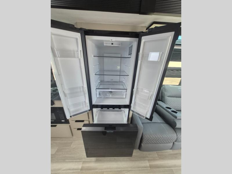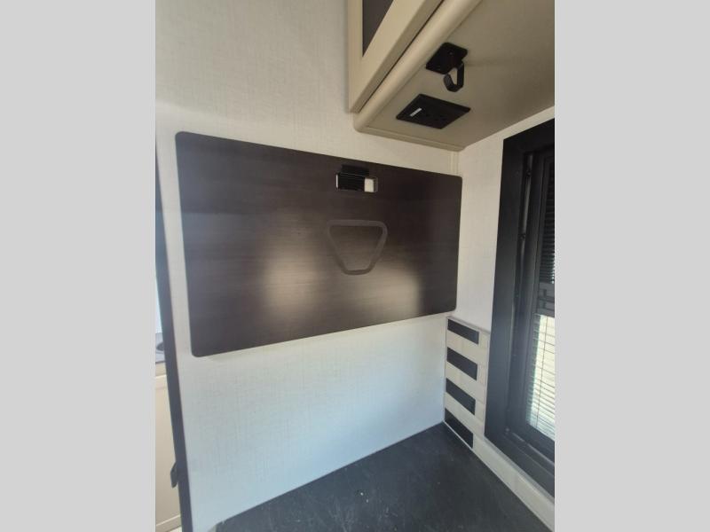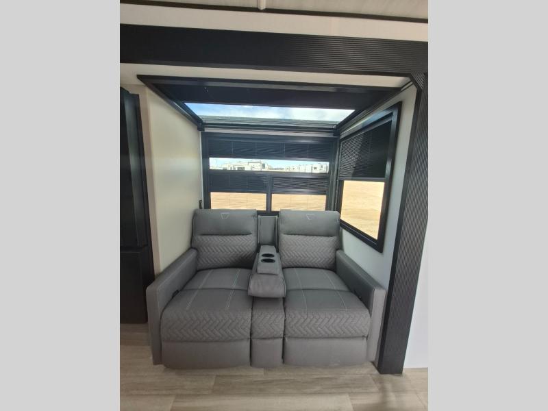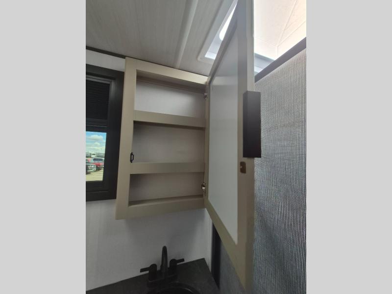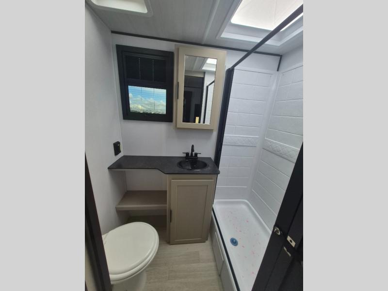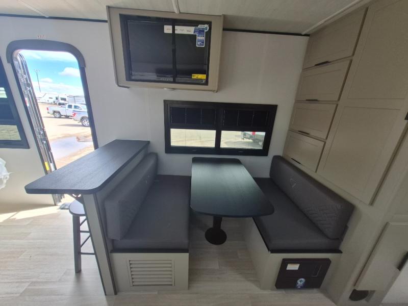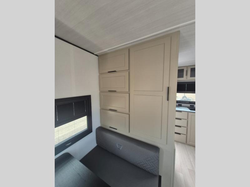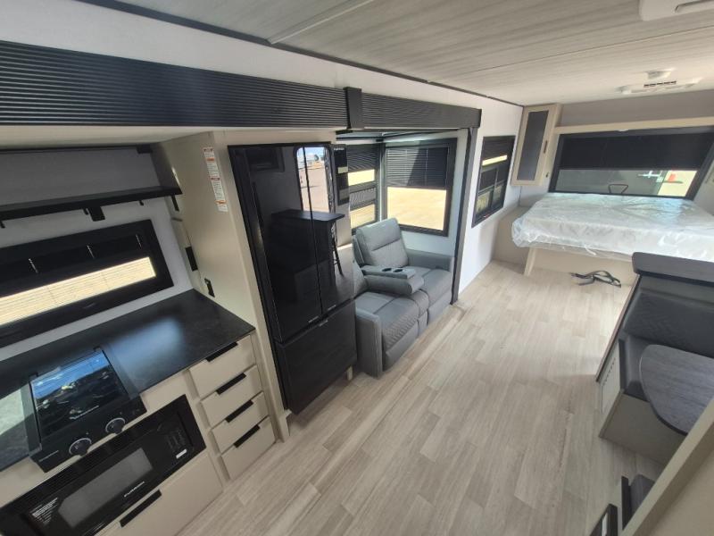 You and your spouse will love this travel trailer’s plush dream day bed with a comfortable bamboo mattress. Ample storage is provided by the wardrobes on each side of the bed, keeping your favorite outfits within easy reach. The booth dinette and theater seating provide perfect spots to enjoy meals, play games, or relax with loved ones. Plus, the layout is designed to maximize comfort and conversation. Whip up meals and snacks with ease and enjoy the convenience of having everything you need in one place since the kitchen is equipped with essentials, including a refrigerator, microwave, and pull-out pantry. Also, the full bathroom provides a convenient private space to get ready for the day.