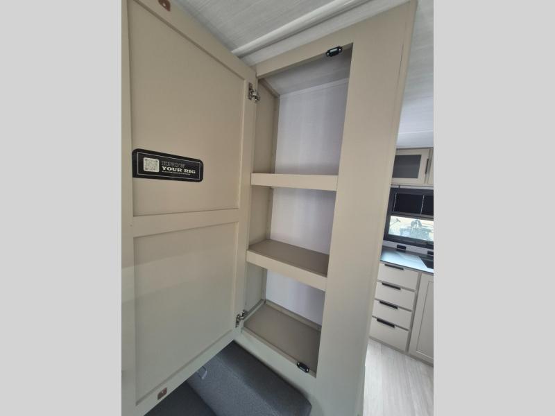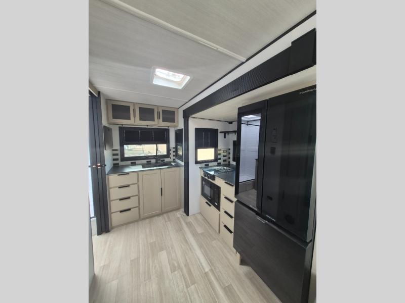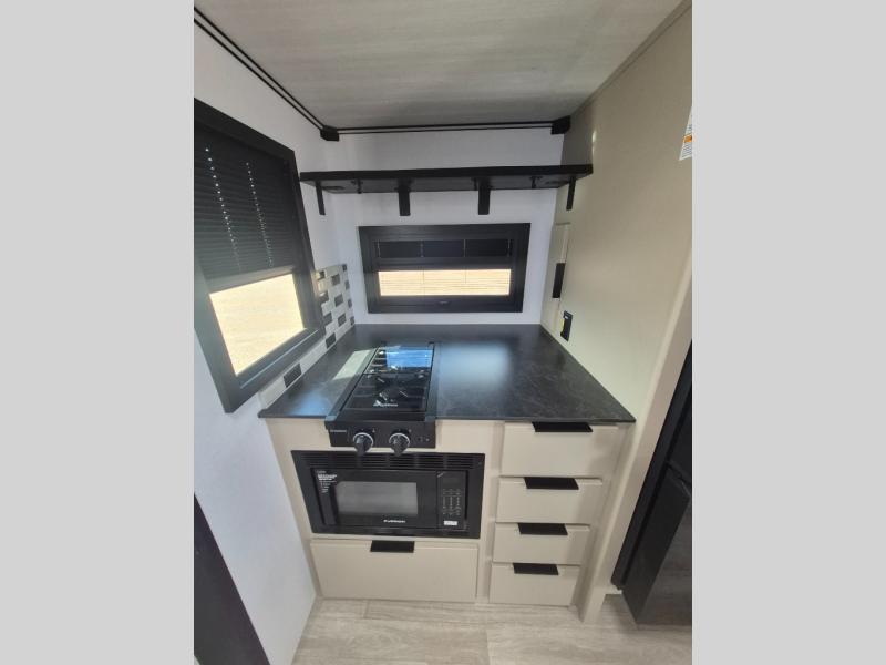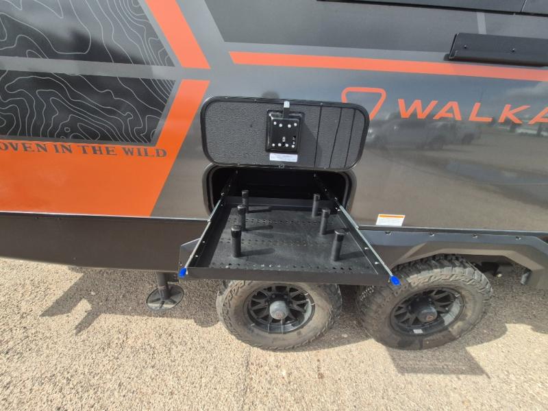 Each Keystone Walkabout travel trailer features a rugged automotive-grade aluminum exterior, designed to withstand the rigors of travel. The 11-gauge aluminum powder corner rails add strength and durability while keeping the trailer lightweight. It is known that storage is key to a comfortable trip. That's why these trailers are designed with maximum storage in mind, providing ample space for all your gear and equipment. You'll also feel like you're gliding down the road, not bouncing along, thanks to the Kurt Touring suspension that ensures a smooth ride, even on rough terrain. Further, the composite solid steps are durable and easy to clean, while the composite Thinscape countertop offers a stylish, low-maintenance surface for food prep and relaxation. Finally, with the 110-volt outlets throughout the trailer, you'll have plenty of power to keep your devices charged and your appliances running.