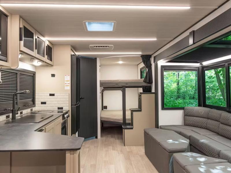 This trailer features double-size bunk beds, perfect for kids or adults, and a front bedroom with a queen bed, shelf, and wardrobes on each side. The living area is a hub of activity, with a super storage sofa that doubles as a comfortable seating area, and two tables that provide plenty of space for meals, games, or working on projects. The kitchen is well-equipped with a refrigerator, overhead cabinets, and a pantry ideal for storing your favorite seasonings. Plus, a 32" TV provides entertainment for the whole family, perfect for relaxing after a long day of exploring, and the full bathroom is a convenient and essential feature, providing a private space to freshen up after a long day.
