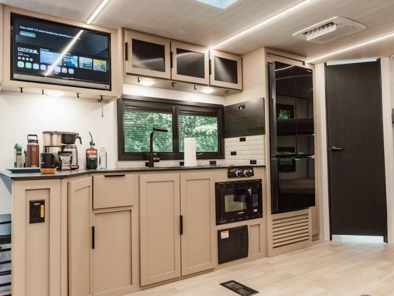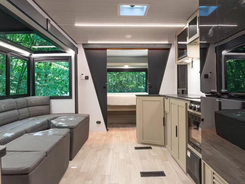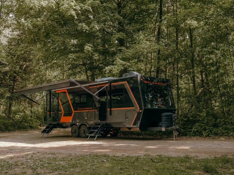 Each Keystone Walkabout travel trailer features a rugged automotive-grade aluminum exterior, designed to withstand the rigors of travel. The 11-gauge aluminum powder corner rails add strength and durability while keeping the trailer lightweight. It is known that storage is key to a comfortable trip. That's why these trailers are designed with maximum storage in mind, providing ample space for all your gear and equipment. You'll also feel like you're gliding down the road, not bouncing along, thanks to the Kurt Touring suspension that ensures a smooth ride, even on rough terrain. Further, the composite solid steps are durable and easy to clean, while the composite Thinscape countertop offers a stylish, low-maintenance surface for food prep and relaxation. Finally, with the 110-volt outlets throughout the trailer, you'll have plenty of power to keep your devices charged and your appliances running.