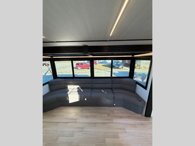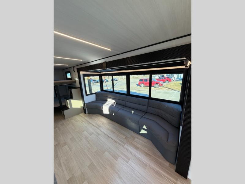 This trailer features double-size bunk beds, perfect for kids or adults, and a front bedroom with a queen bed, shelf, and wardrobes on each side. The living area is a hub of activity, with a super storage sofa that doubles as a comfortable seating area, and two tables that provide plenty of space for meals, games, or working on projects. The kitchen is well-equipped with a refrigerator, overhead cabinets, and a pantry ideal for storing your favorite seasonings. Plus, a 32" TV provides entertainment for the whole family, perfect for relaxing after a long day of exploring, and the full bathroom is a convenient and essential feature, providing a private space to freshen up after a long day.