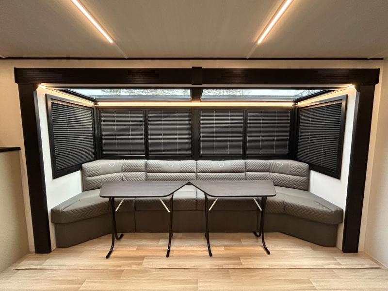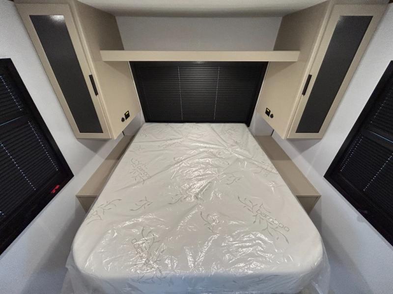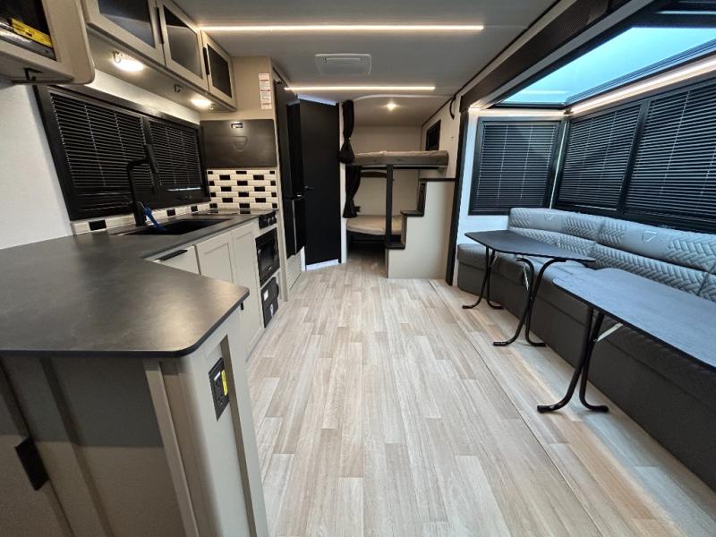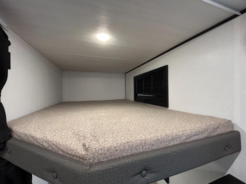 This trailer features double-size bunk beds, perfect for kids or adults, and a front bedroom with a queen bed, shelf, and wardrobes on each side. The living area is a hub of activity, with a super storage sofa that doubles as a comfortable seating area, and two tables that provide plenty of space for meals, games, or working on projects. The kitchen is well-equipped with a refrigerator, overhead cabinets, and a pantry ideal for storing your favorite seasonings. Plus, a 32" TV provides entertainment for the whole family, perfect for relaxing after a long day of exploring, and the full bathroom is a convenient and essential feature, providing a private space to freshen up after a long day.