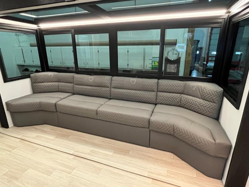 This trailer features double-size bunk beds, perfect for kids or adults, and a front bedroom with a queen bed, shelf, and wardrobes on each side. The living area is a hub of activity, with a super storage sofa that doubles as a comfortable seating area, and two tables that provide plenty of space for meals, games, or working on projects. The kitchen is well-equipped with a refrigerator, overhead cabinets, and a pantry ideal for storing your favorite seasonings. Plus, a 32" TV provides entertainment for the whole family, perfect for relaxing after a long day of exploring, and the full bathroom is a convenient and essential feature, providing a private space to freshen up after a long day.