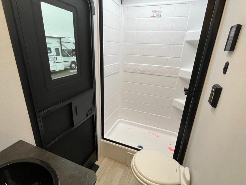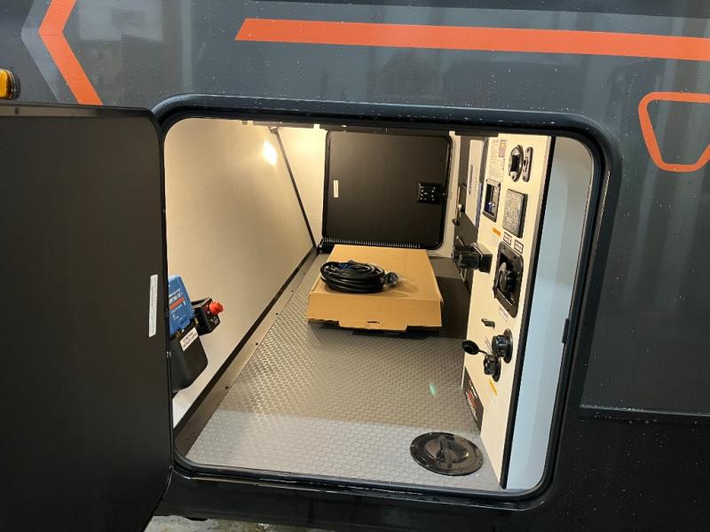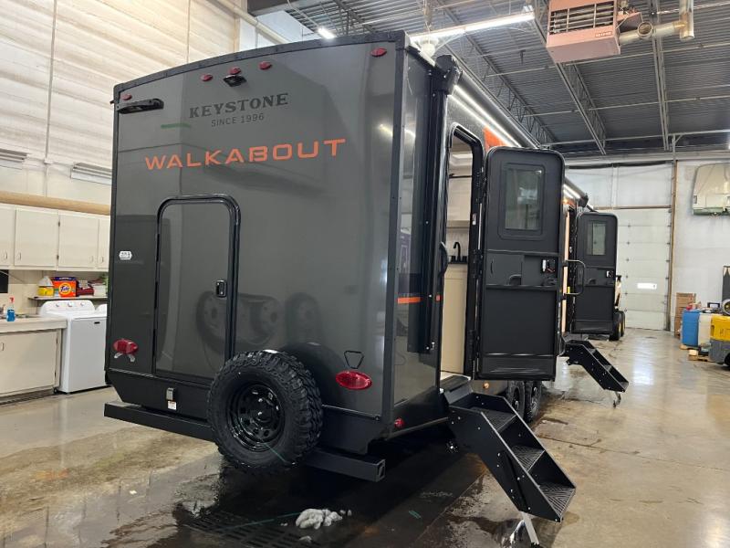 Each Keystone Walkabout travel trailer features a rugged automotive-grade aluminum exterior, designed to withstand the rigors of travel. The 11-gauge aluminum powder corner rails add strength and durability while keeping the trailer lightweight. It is known that storage is key to a comfortable trip. That's why these trailers are designed with maximum storage in mind, providing ample space for all your gear and equipment. You'll also feel like you're gliding down the road, not bouncing along, thanks to the Kurt Touring suspension that ensures a smooth ride, even on rough terrain. Further, the composite solid steps are durable and easy to clean, while the composite Thinscape countertop offers a stylish, low-maintenance surface for food prep and relaxation. Finally, with the 110-volt outlets throughout the trailer, you'll have plenty of power to keep your devices charged and your appliances running.
