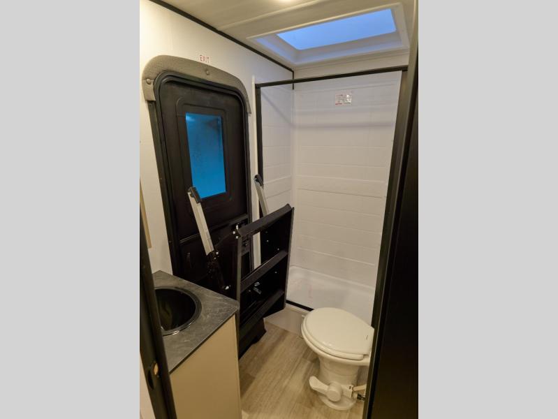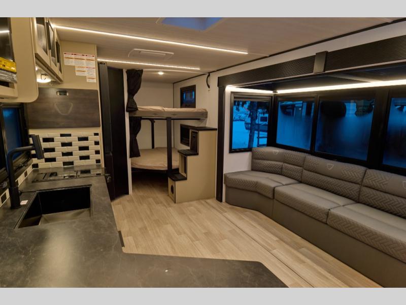 This trailer features double-size bunk beds, perfect for kids or adults, and a front bedroom with a queen bed, shelf, and wardrobes on each side. The living area is a hub of activity, with a super storage sofa that doubles as a comfortable seating area, and two tables that provide plenty of space for meals, games, or working on projects. The kitchen is well-equipped with a refrigerator, overhead cabinets, and a pantry ideal for storing your favorite seasonings. Plus, a 32" TV provides entertainment for the whole family, perfect for relaxing after a long day of exploring, and the full bathroom is a convenient and essential feature, providing a private space to freshen up after a long day.