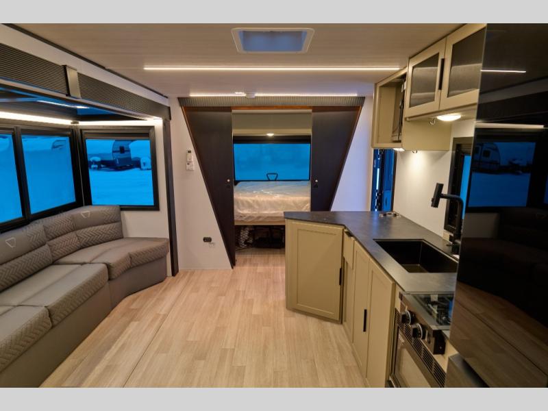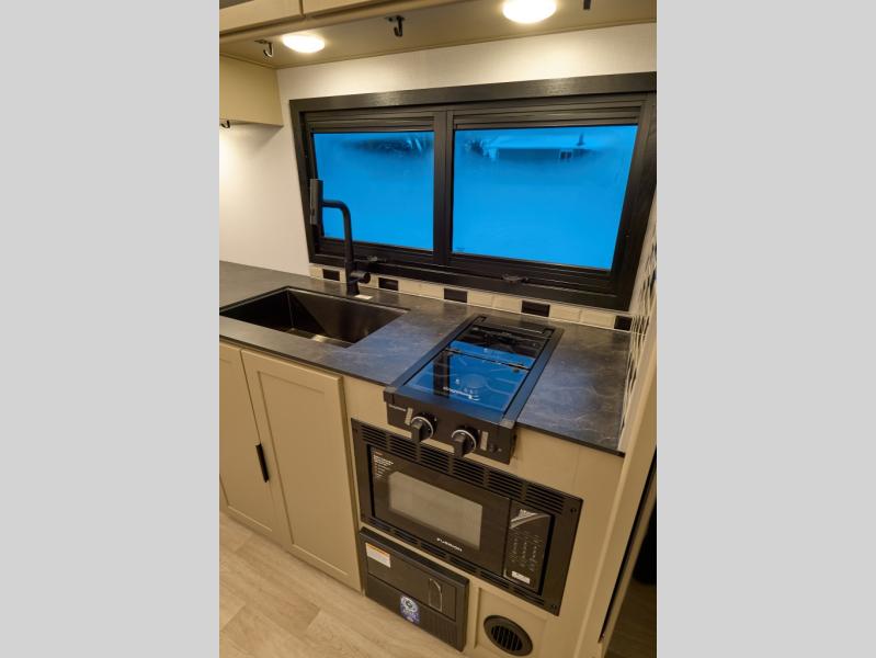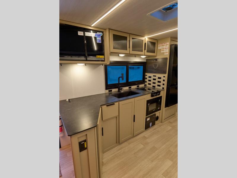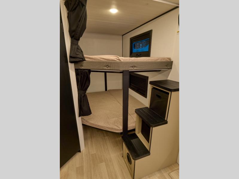 Each Keystone Walkabout travel trailer features a rugged automotive-grade aluminum exterior, designed to withstand the rigors of travel. The 11-gauge aluminum powder corner rails add strength and durability while keeping the trailer lightweight. It is known that storage is key to a comfortable trip. That's why these trailers are designed with maximum storage in mind, providing ample space for all your gear and equipment. You'll also feel like you're gliding down the road, not bouncing along, thanks to the Kurt Touring suspension that ensures a smooth ride, even on rough terrain. Further, the composite solid steps are durable and easy to clean, while the composite Thinscape countertop offers a stylish, low-maintenance surface for food prep and relaxation. Finally, with the 110-volt outlets throughout the trailer, you'll have plenty of power to keep your devices charged and your appliances running.