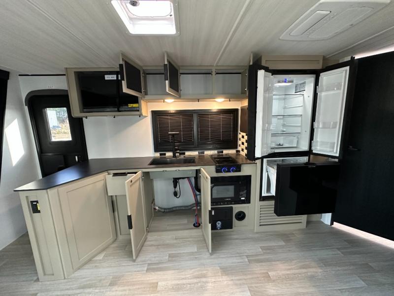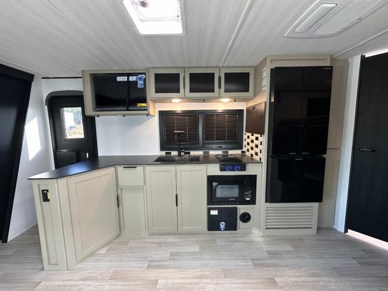 Each Keystone Walkabout travel trailer features a rugged automotive-grade aluminum exterior, designed to withstand the rigors of travel. The 11-gauge aluminum powder corner rails add strength and durability while keeping the trailer lightweight. It is known that storage is key to a comfortable trip. That's why these trailers are designed with maximum storage in mind, providing ample space for all your gear and equipment. You'll also feel like you're gliding down the road, not bouncing along, thanks to the Kurt Touring suspension that ensures a smooth ride, even on rough terrain. Further, the composite solid steps are durable and easy to clean, while the composite Thinscape countertop offers a stylish, low-maintenance surface for food prep and relaxation. Finally, with the 110-volt outlets throughout the trailer, you'll have plenty of power to keep your devices charged and your appliances running.