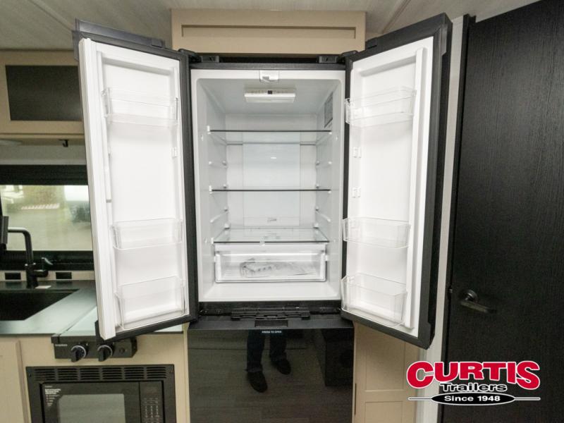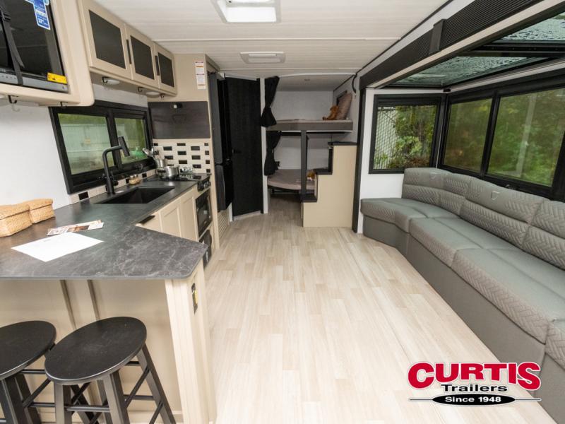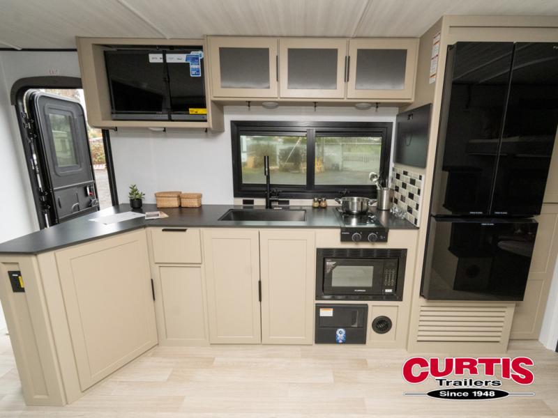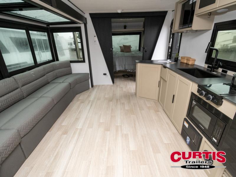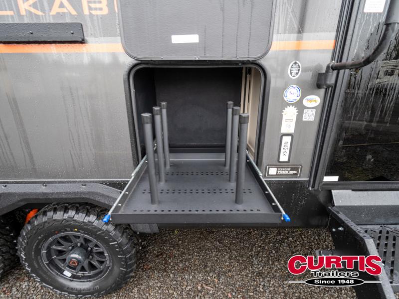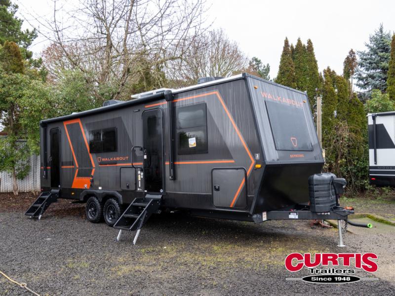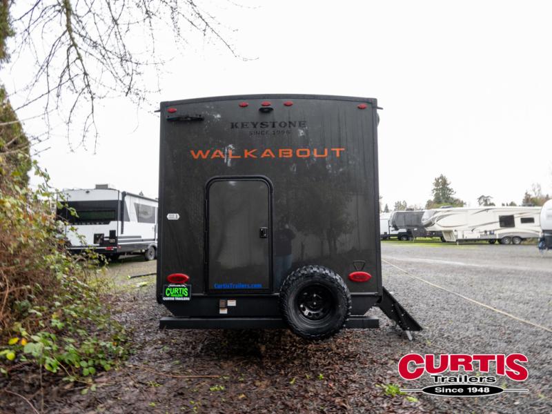 Each Keystone Walkabout travel trailer features a rugged automotive-grade aluminum exterior, designed to withstand the rigors of travel. The 11-gauge aluminum powder corner rails add strength and durability while keeping the trailer lightweight. It is known that storage is key to a comfortable trip. That's why these trailers are designed with maximum storage in mind, providing ample space for all your gear and equipment. You'll also feel like you're gliding down the road, not bouncing along, thanks to the Kurt Touring suspension that ensures a smooth ride, even on rough terrain. Further, the composite solid steps are durable and easy to clean, while the composite Thinscape countertop offers a stylish, low-maintenance surface for food prep and relaxation. Finally, with the 110-volt outlets throughout the trailer, you'll have plenty of power to keep your devices charged and your appliances running.