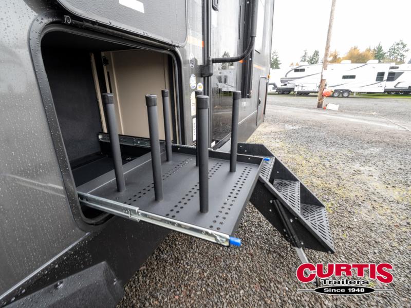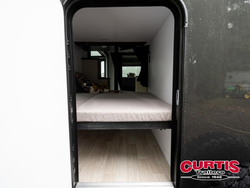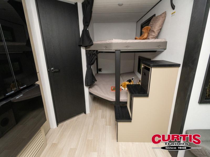 This trailer features double-size bunk beds, perfect for kids or adults, and a front bedroom with a queen bed, shelf, and wardrobes on each side. The living area is a hub of activity, with a super storage sofa that doubles as a comfortable seating area, and two tables that provide plenty of space for meals, games, or working on projects. The kitchen is well-equipped with a refrigerator, overhead cabinets, and a pantry ideal for storing your favorite seasonings. Plus, a 32" TV provides entertainment for the whole family, perfect for relaxing after a long day of exploring, and the full bathroom is a convenient and essential feature, providing a private space to freshen up after a long day.