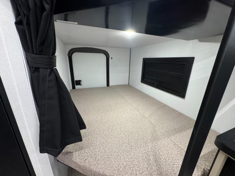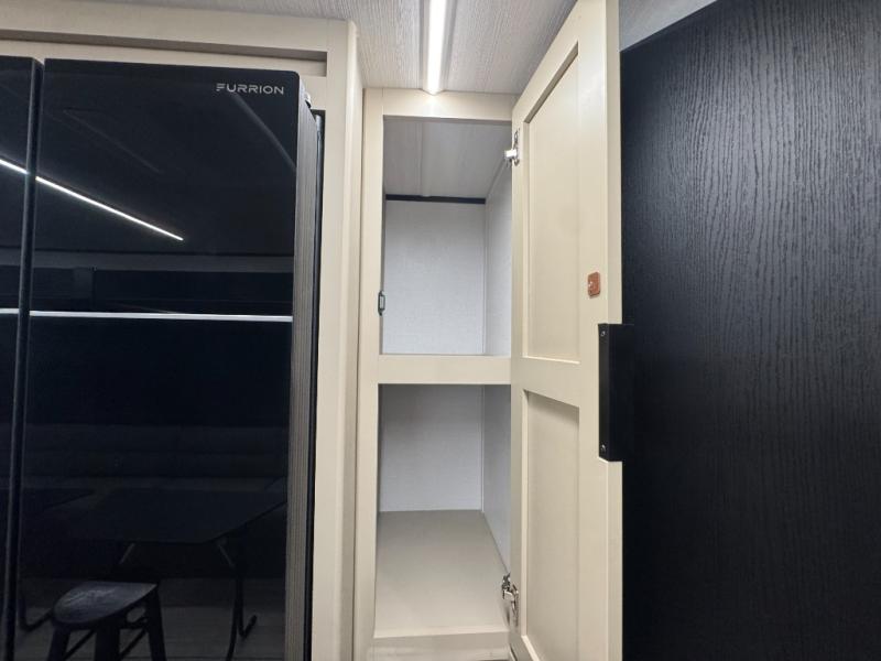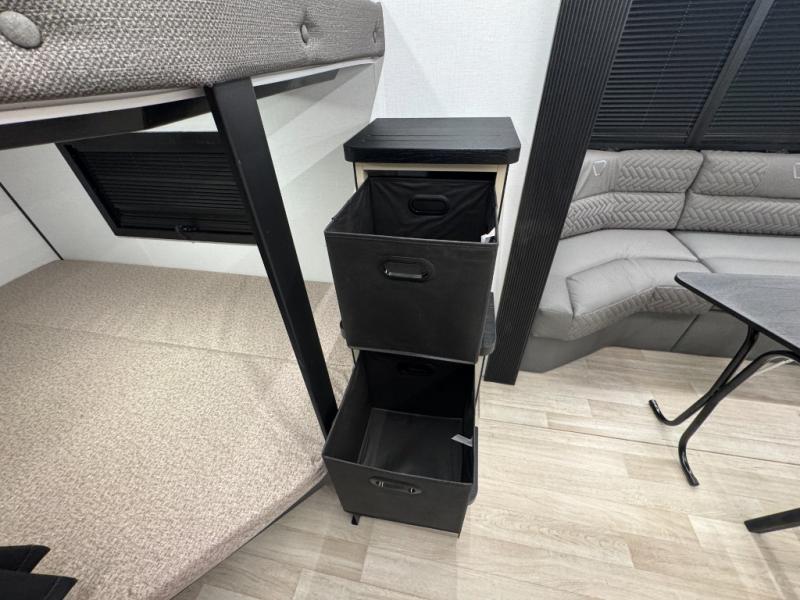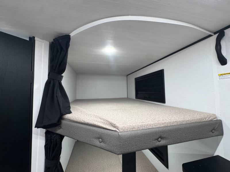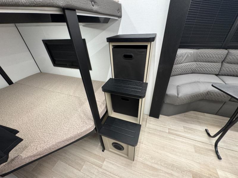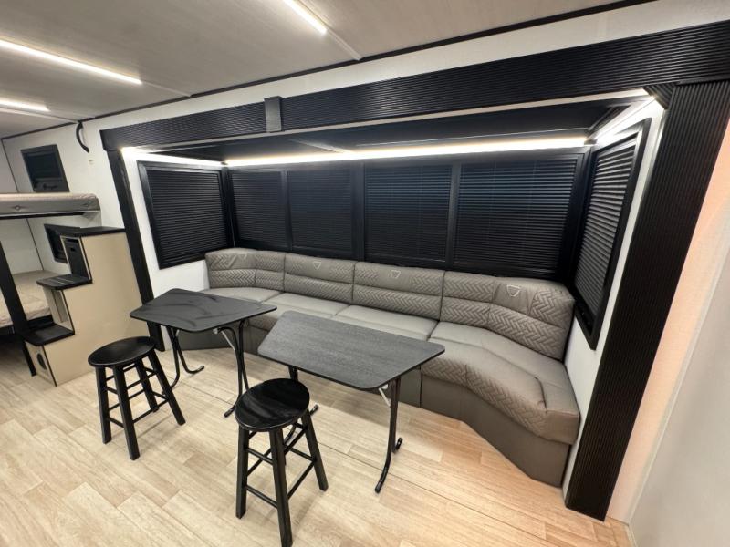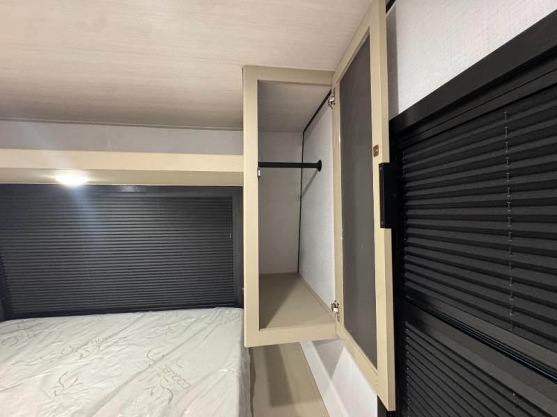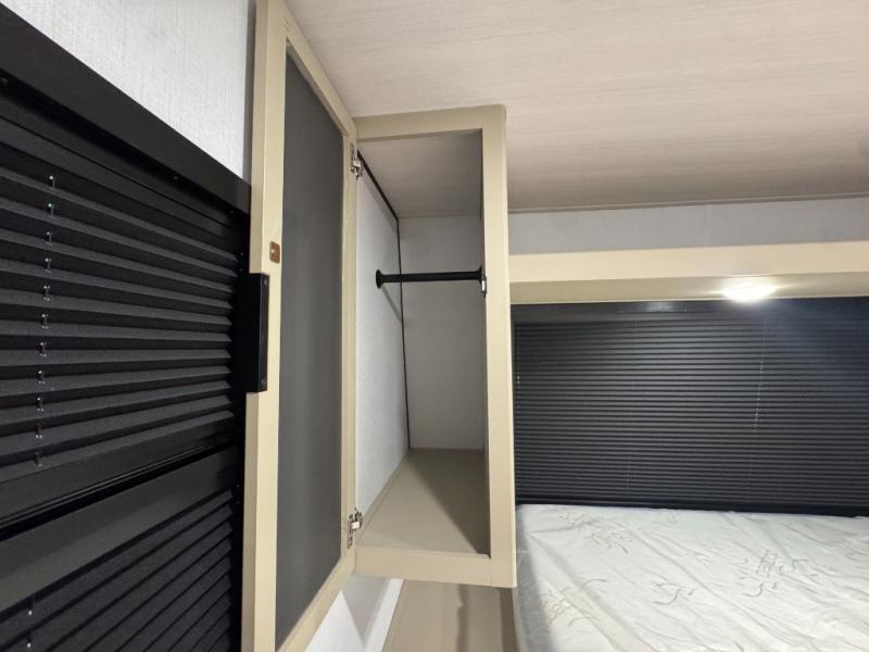 This trailer features double-size bunk beds, perfect for kids or adults, and a front bedroom with a queen bed, shelf, and wardrobes on each side. The living area is a hub of activity, with a super storage sofa that doubles as a comfortable seating area, and two tables that provide plenty of space for meals, games, or working on projects. The kitchen is well-equipped with a refrigerator, overhead cabinets, and a pantry ideal for storing your favorite seasonings. Plus, a 32" TV provides entertainment for the whole family, perfect for relaxing after a long day of exploring, and the full bathroom is a convenient and essential feature, providing a private space to freshen up after a long day.