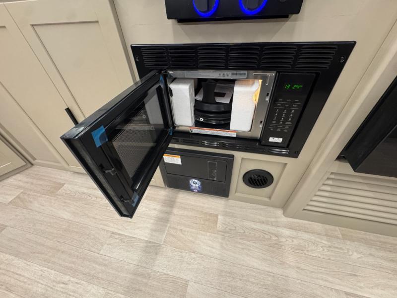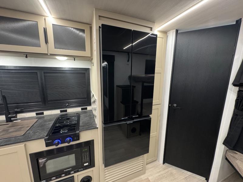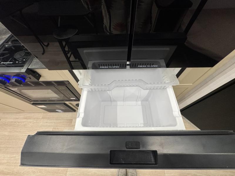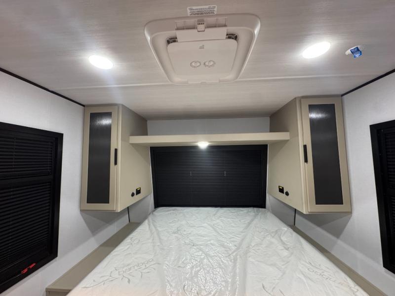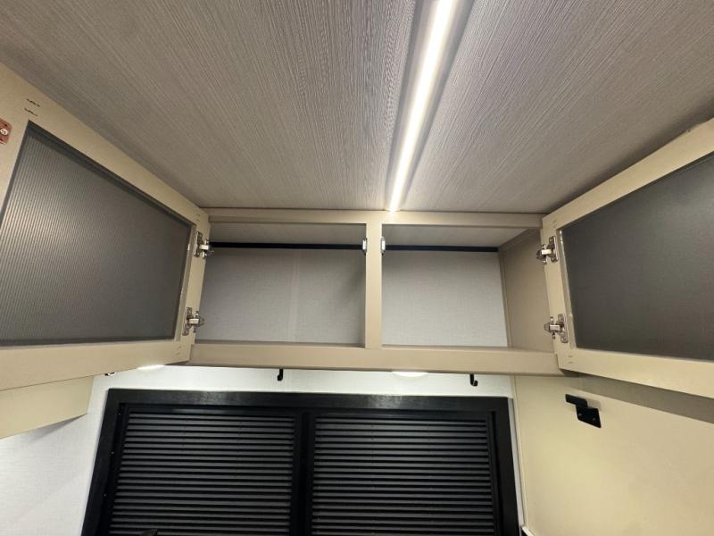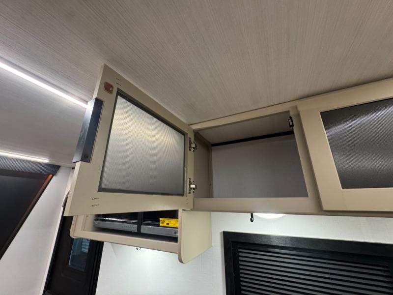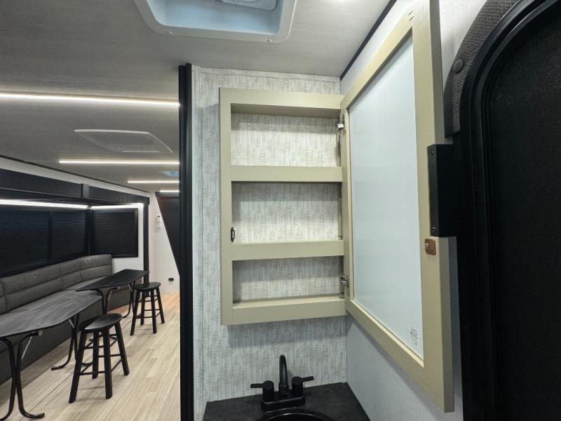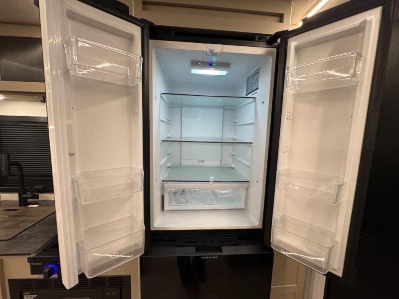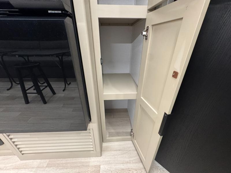 This trailer features double-size bunk beds, perfect for kids or adults, and a front bedroom with a queen bed, shelf, and wardrobes on each side. The living area is a hub of activity, with a super storage sofa that doubles as a comfortable seating area, and two tables that provide plenty of space for meals, games, or working on projects. The kitchen is well-equipped with a refrigerator, overhead cabinets, and a pantry ideal for storing your favorite seasonings. Plus, a 32" TV provides entertainment for the whole family, perfect for relaxing after a long day of exploring, and the full bathroom is a convenient and essential feature, providing a private space to freshen up after a long day.