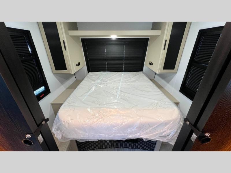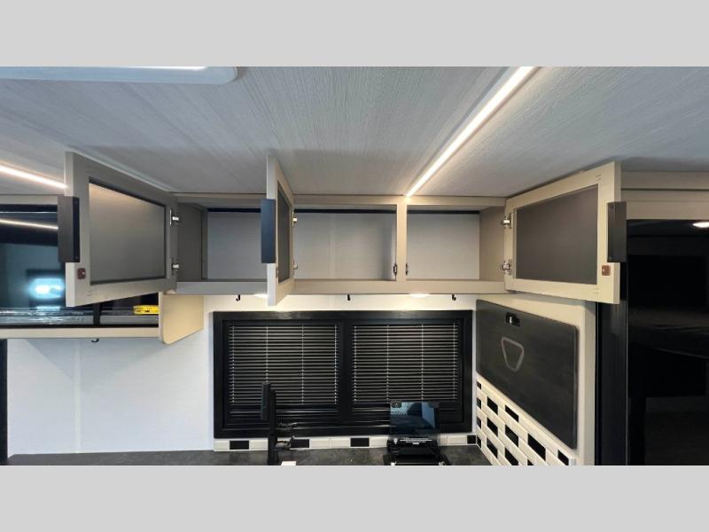 This trailer features double-size bunk beds, perfect for kids or adults, and a front bedroom with a queen bed, shelf, and wardrobes on each side. The living area is a hub of activity, with a super storage sofa that doubles as a comfortable seating area, and two tables that provide plenty of space for meals, games, or working on projects. The kitchen is well-equipped with a refrigerator, overhead cabinets, and a pantry ideal for storing your favorite seasonings. Plus, a 32" TV provides entertainment for the whole family, perfect for relaxing after a long day of exploring, and the full bathroom is a convenient and essential feature, providing a private space to freshen up after a long day.