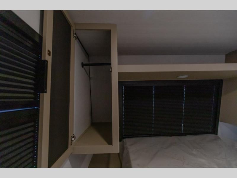 This trailer features double-size bunk beds, perfect for kids or adults, and a front bedroom with a queen bed, shelf, and wardrobes on each side. The living area is a hub of activity, with a super storage sofa that doubles as a comfortable seating area, and two tables that provide plenty of space for meals, games, or working on projects. The kitchen is well-equipped with a refrigerator, overhead cabinets, and a pantry ideal for storing your favorite seasonings. Plus, a 32" TV provides entertainment for the whole family, perfect for relaxing after a long day of exploring, and the full bathroom is a convenient and essential feature, providing a private space to freshen up after a long day.
