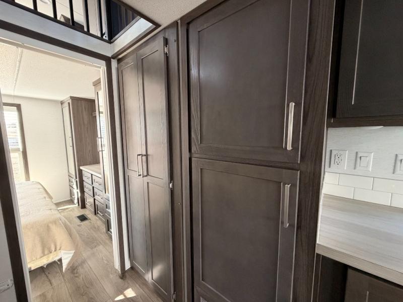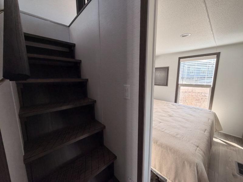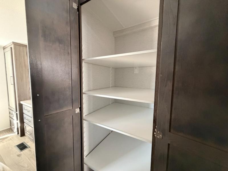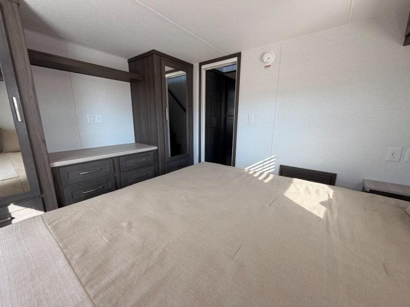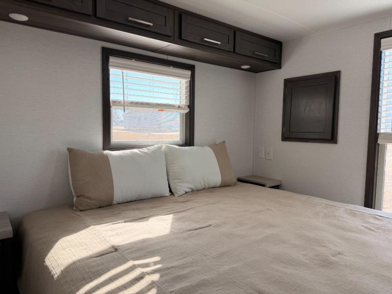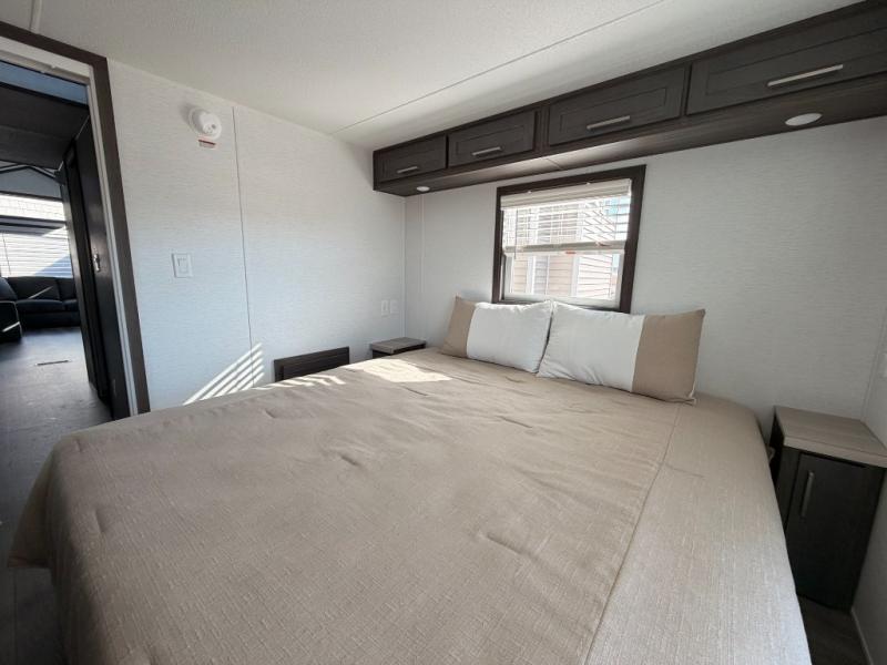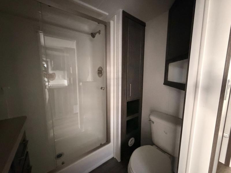 This Lakeside Series park model will serve as an excellent destination for fun! It has all of the major necessities, and it gives you a taste of residential living. The kitchen's hutch will store many dishes that are needed to prepare and serve meals, and the 18-cubic foot refrigerator can hold onto the foods you need to feed your family. Keep your clothing stored away in the bedroom's two closets with drawers, and keep your towels in the bathroom's linen closet. A hide-a-bed sofa and swivel rocker chair give you places to sit down and relax in the living room, and you can come and go as you please through the patio door.