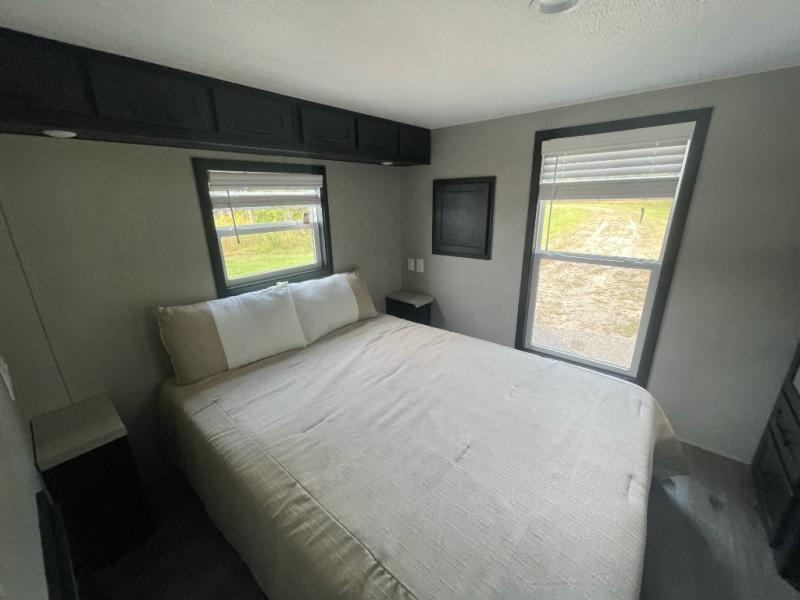 Lots of fun will be had in this park model It has all of the major necessities, and it gives you a taste of residential living. The kitchen's hutch will store many dishes that are needed to prepare and serve meals, and the 18-cubic foot refrigerator can hold onto the foods you need to feed your family. Keep your clothing stored away in the bedroom's two closets with drawers, and keep your towels in the bathroom's linen closet. A hide-a-bed sofa and swivel rocker chair give you places to sit down and relax in the living room, and you can come and go as you please through the patio door.