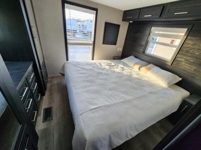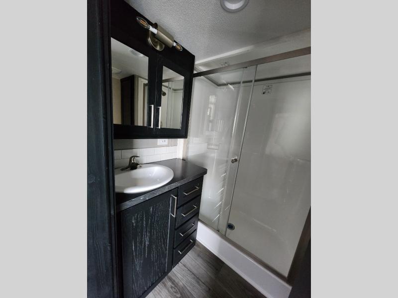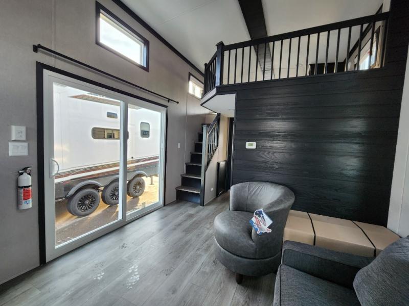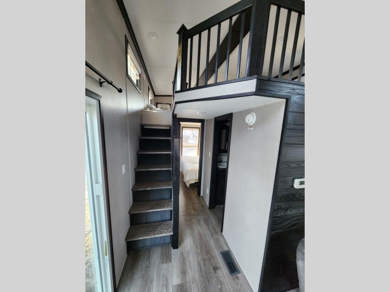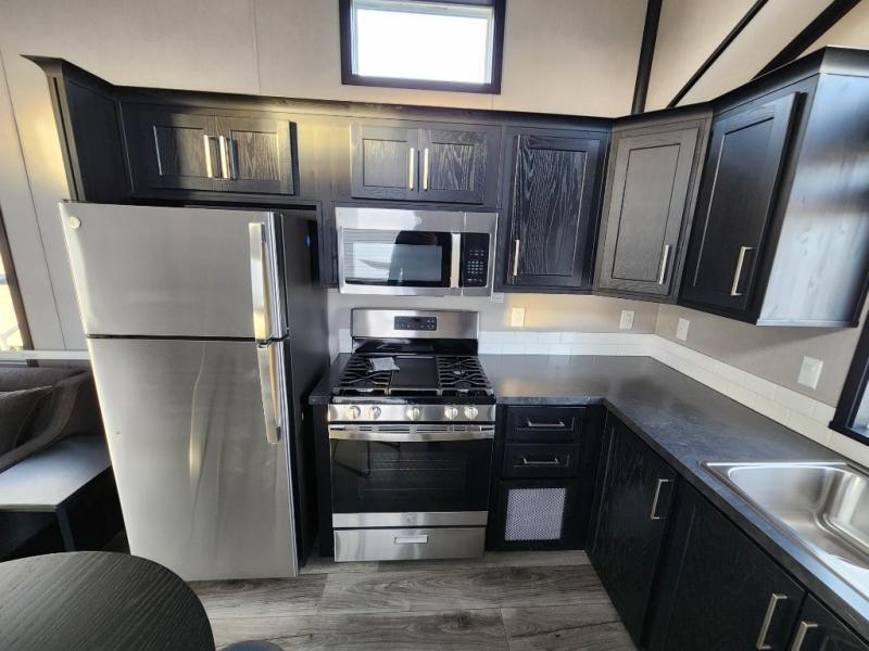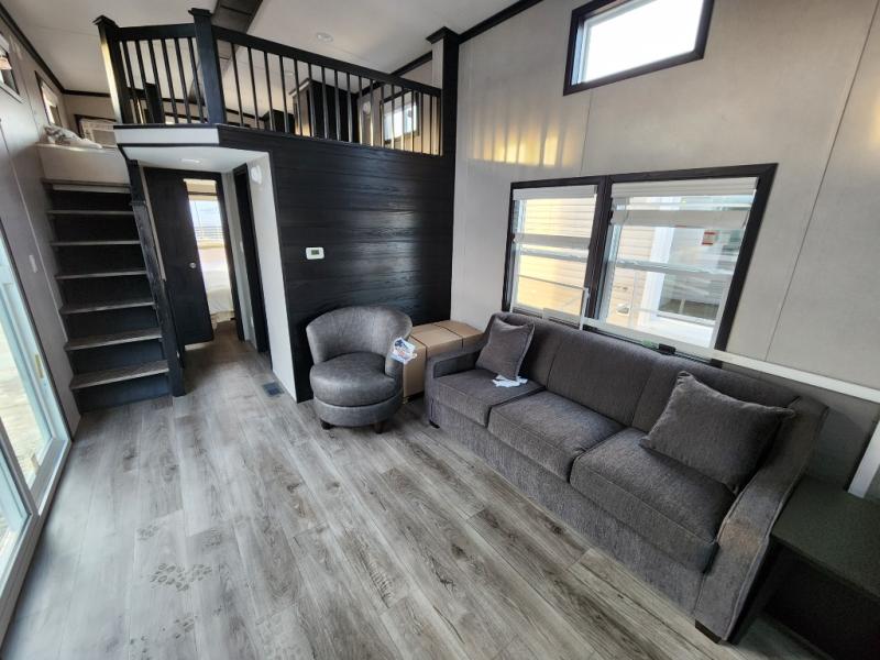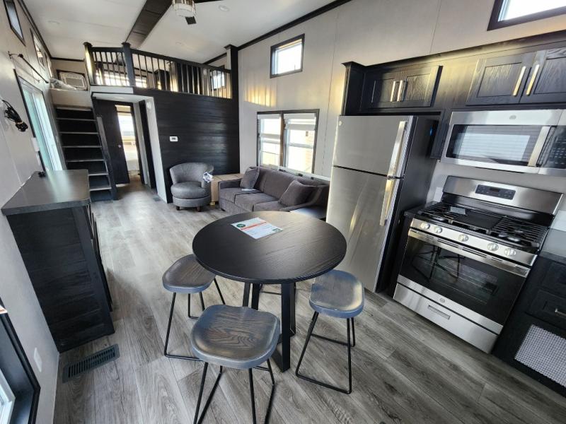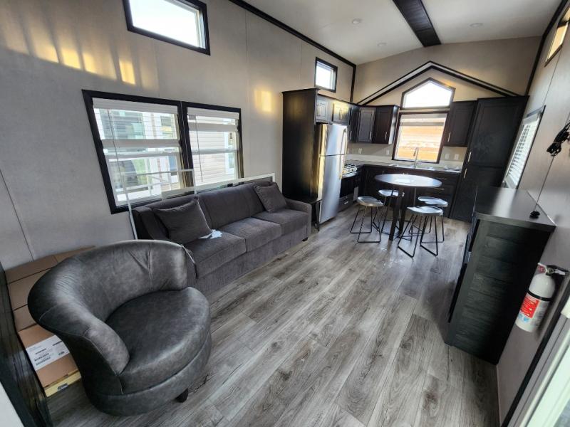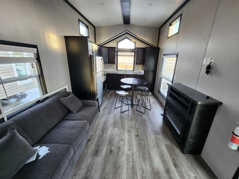 With a front kitchen in this park model, you will have plenty of space to create your favorite meals! You can spend all day relaxing and enjoying the outdoors, and the evenings can be filled with fun inside this model. Across from the hide-a-bed sofa is an entertainment center with an optional fireplace. You'll feel right at home when you use the four-burner range to get breakfast together, and the 18-cubic foot refrigerator can store just about anything. The 6" vinyl sliding patio door lets in plenty of sunlight and is next to the stairs that lead to the loft area. Freshen up in the 54" shower before heading to bed in the rear private bedroom on a king bed!
