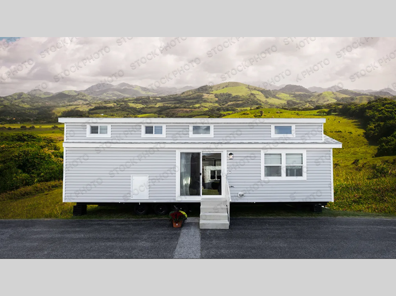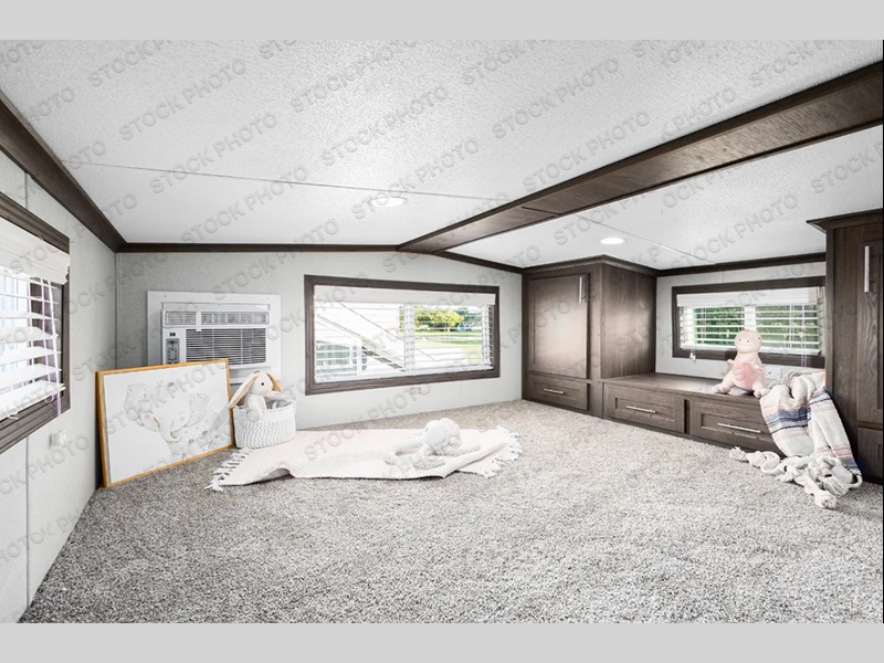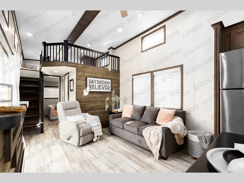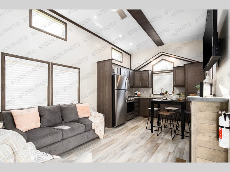 With a front kitchen in this park model, you will have plenty of space to create your favorite meals! You can spend all day relaxing and enjoying the outdoors, and the evenings can be filled with fun inside this model. Across from the hide-a-bed sofa is an entertainment center with an optional fireplace. You'll feel right at home when you use the four-burner range to get breakfast together, and the 18-cubic foot refrigerator can store just about anything. The 6" vinyl sliding patio door lets in plenty of sunlight and is next to the stairs that lead to the loft area. Freshen up in the 54" shower before heading to bed in the rear private bedroom on a king bed!