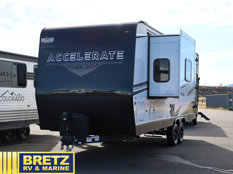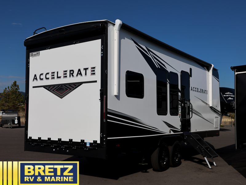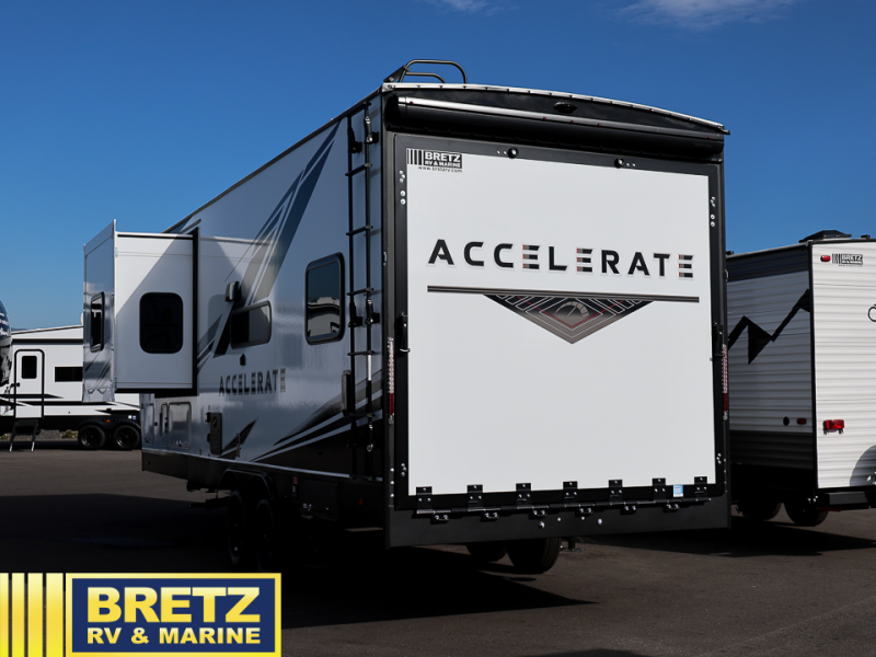 With any Accelerate toy hauler by KZ, you will enjoy solid construction materials, comfortable interiors, and convenient amenities! There are flip-up steps outside for added stability, along with a pass-thru storage for your hiking gear, fishing poles and more. Each fifth wheel and travel trailer includes a private bedroom with a queen bed slide, full bath and kitchen amenities, plus interior storage for personal belongings, food and more. The ramp door with a patio rail kit will make it easier than ever to load and unload your toys, and the drop-down bed with a ladder lets you convert the garage space to sleeping space at night!