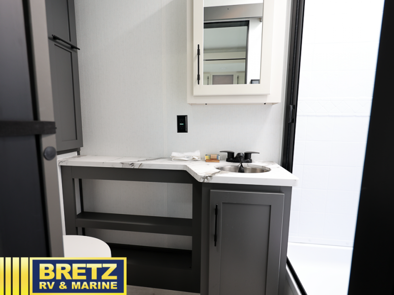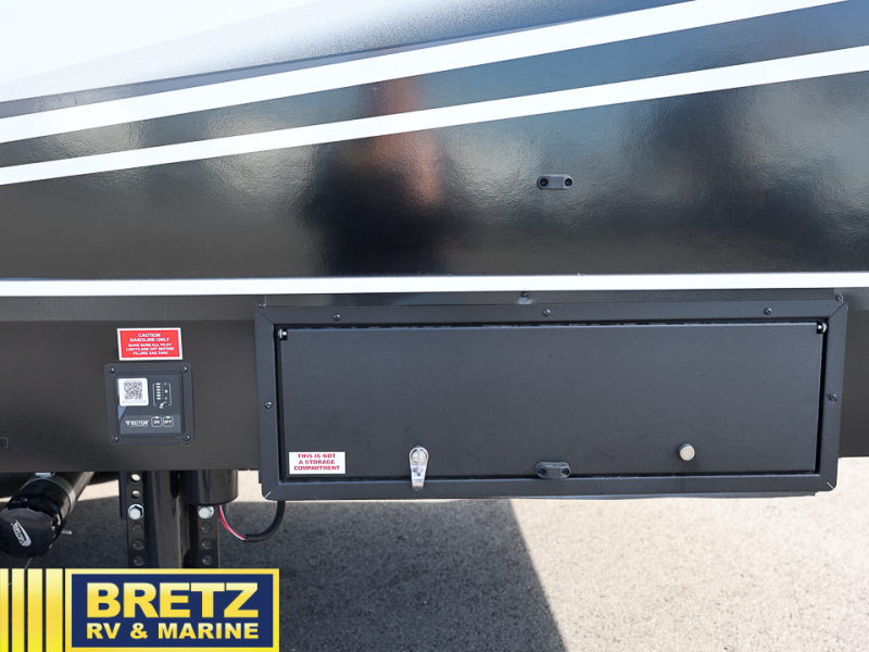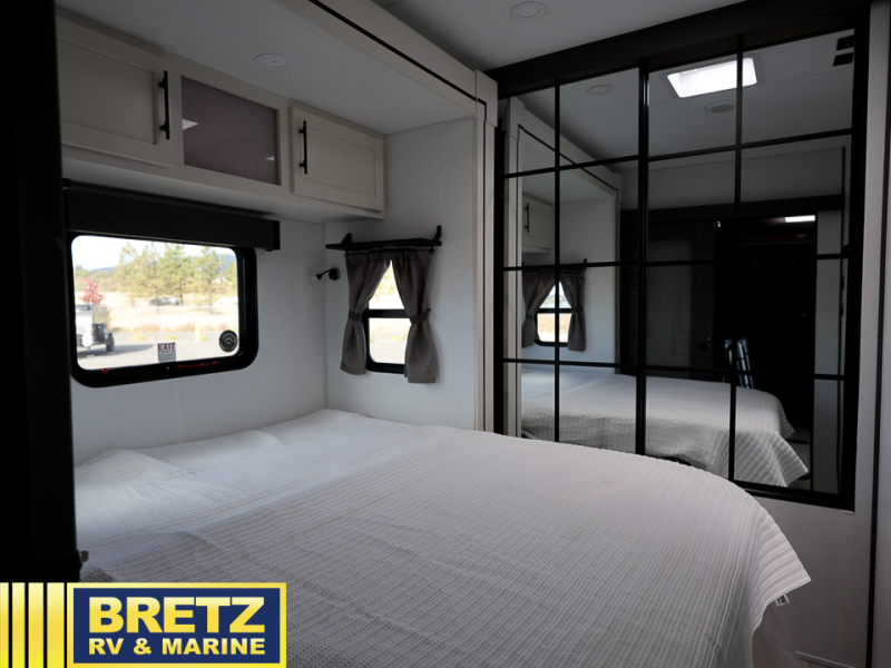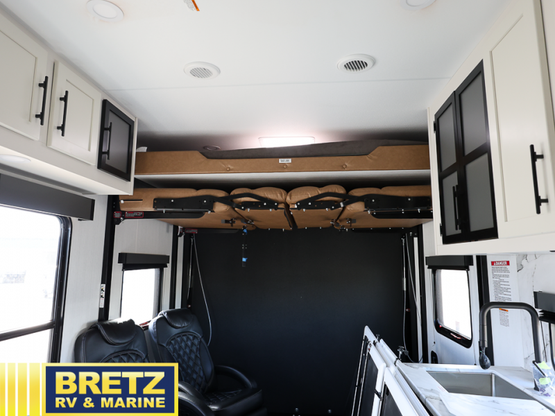 This toy hauler is perfect for trips to the lake or woods with your crew! Once you've unloaded the pass-thru storage, you can put out the 20' awning, then relax in your camp chairs. There is 15' total garage space when you utilize the area up to the front master bedroom, and the garage can double as a bedroom at night for guests thanks to the power bed with Sit & Sleep. The master bedroom includes a queen bed slide out, a spacious wardrobe, and a full bath, allowing you quick access at night.