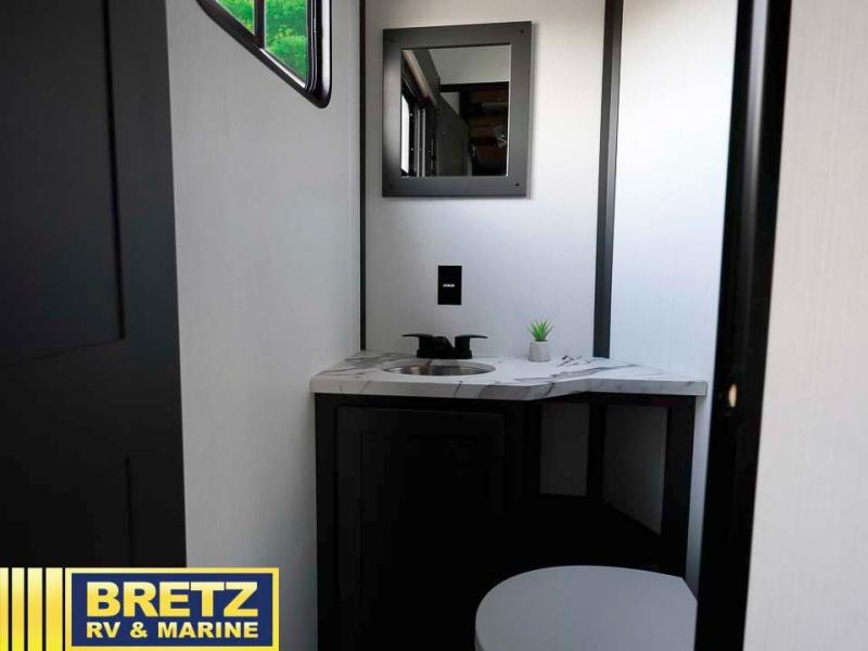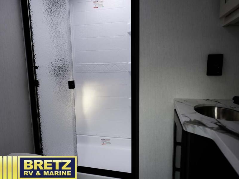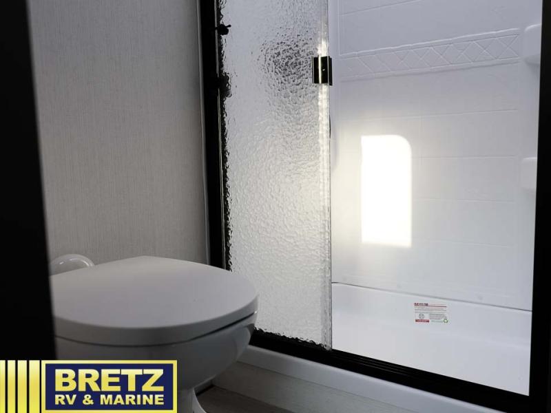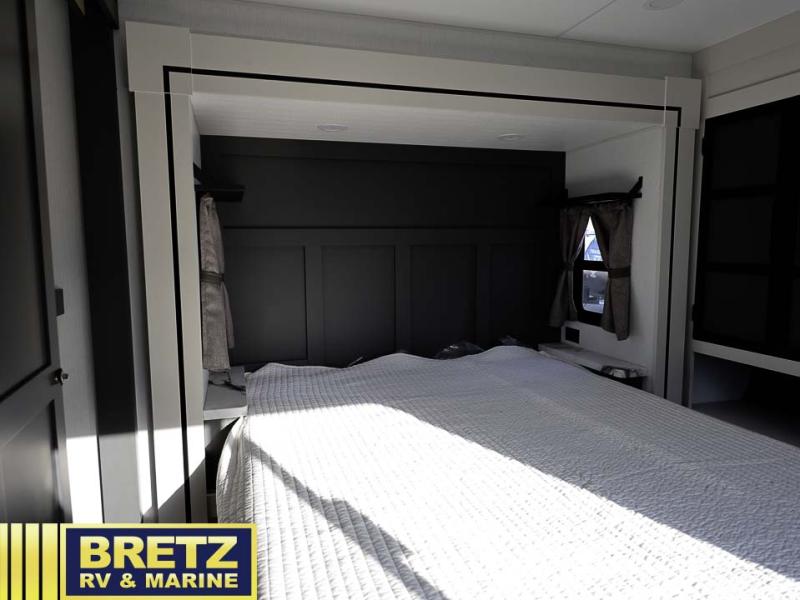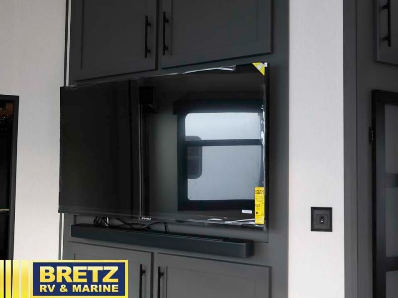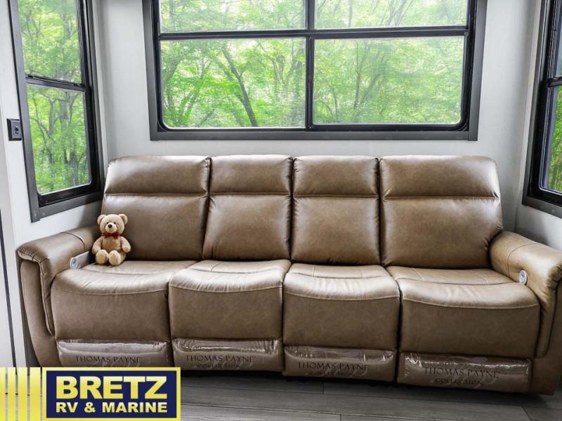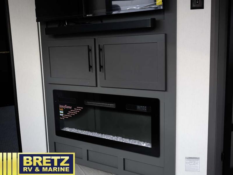 Make each adventure count in this triple slide out toy hauler! Unload your toys from the 11' separate garage, then utilize the rear pull-down screen to keep bugs out while you visit with your crew. There is a power bed with Sit & Sleep here, along with a laminated bed base, a convenient half bath, and a TV backer if you want to add a television. And if you'd like more protection than a screen, an optional 3-seasons patio door can be added here also. The middle kitchen and living room will be a favorite hang-out spot with its dual opposing slides for more space, super sofa theater seating for relaxing, and fireplace with a swing-arm TV for movie nights! Towards the front you'll find the full bath and front private bedroom, complete with a queen bed slide out, dresser with hidden storage, and stackable washer/dryer prep for the option to add these appliances.