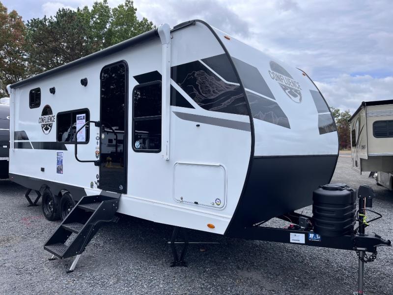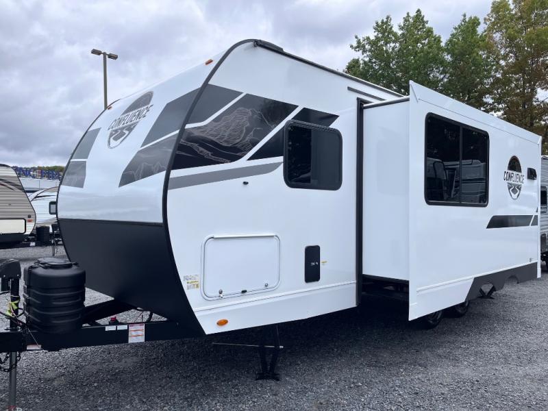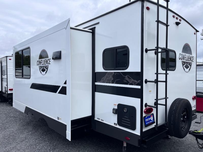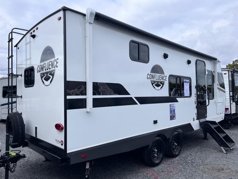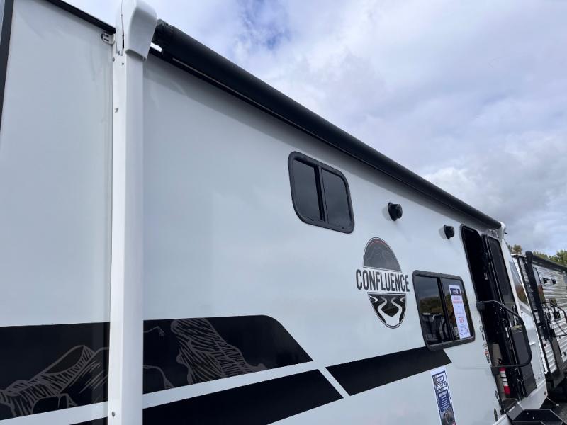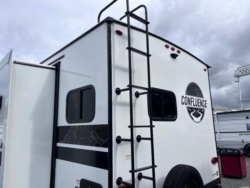 With any Confluence travel trailer by KZ you will find a white exterior fiberglass that is not only eye-catching, but easy to keep clean as well. The protective front diamond plate will help protect your trailer from rock and debris on the way to the campground, and the four stabilizer jacks will make for easy set-up once you arrive. Each model includes the Climate Package which features a heated, insulated, and enclosed underbelly with 12V heat pads and enclosed dump valves so you can camp well into the colder months. These pet-friendly models include a leash latch that will also double as a beverage opener, and there is an outside shower to fill the dogs water bowl. You will also enjoy the multi-media entertainment system with a DVD player, two 6.5" interior speakers for those rainy days. Start a new adventure today in a Confluence trailer trailer!