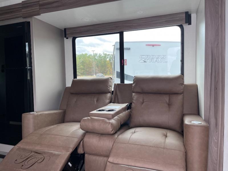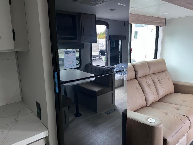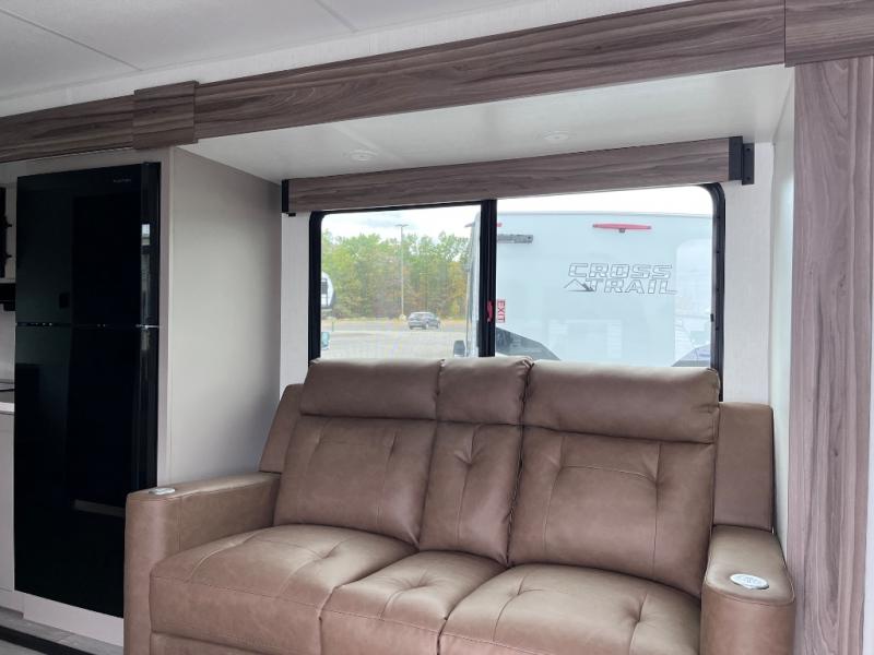 You'll feel right at home in this couple's travel trailer with space for an overnight guest on the booth dinette. The theater seating within the large slide out will be the perfect place to enjoy your coffee each morning, or you may want to sit outdoors under the 18' power awning. Prepare breakfast on the three burner cooktop or use the convenient microwave oven if you're on the go! There is a full bath that will allow you to clean up after a day outdoors, and the front bedroom includes a king bed for your comfort. You'll also find shirt closets with storage and two 12V USB ports in the bedroom to charge your phone, tablet, or camera!