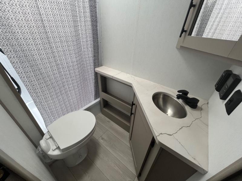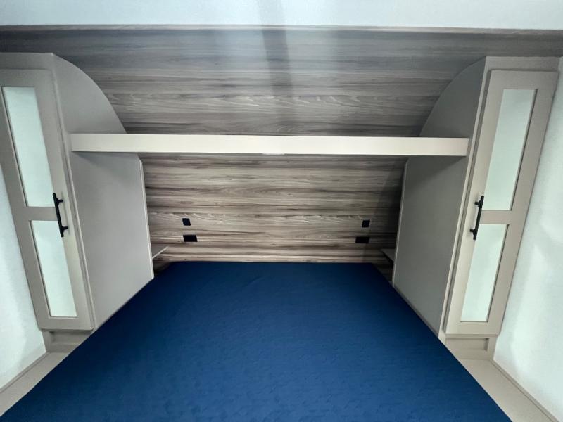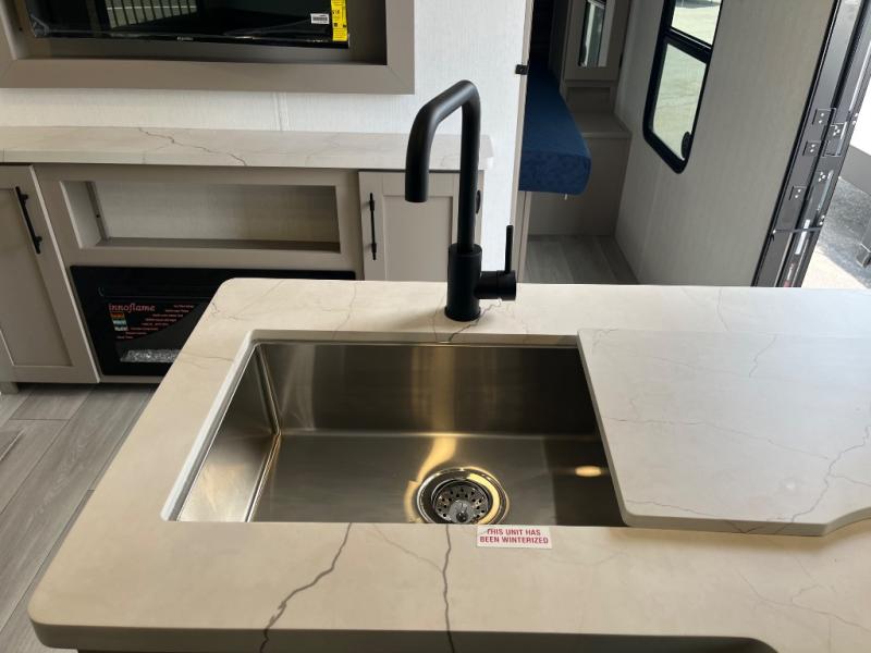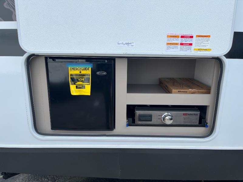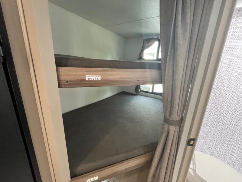 Head to your local state park in this travel trailer that can sleep 7-8 people each night. The double-size bunks will be great for little ones, while you and your spouse take the king bed in the front private bedroom. You'll also find a U-shaped dinette within the slide for seating and sleeping space. This model includes an outside kitchen with a refrigerator and an outside griddle that will be perfect for pancakes in the morning. And don't forget to check out the storage throughout in this model, including dual shirt closets, a pantry, front pass-through storage, plus an exterior trunk door beneath the bunks for extra gear!