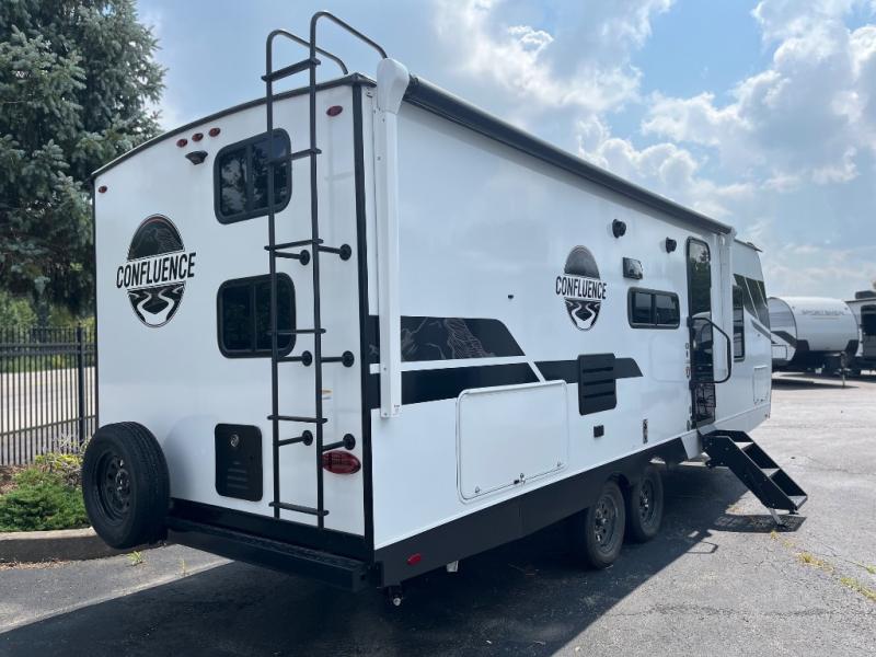 With any Confluence travel trailer by KZ you will find a white exterior fiberglass that is not only eye-catching, but easy to keep clean as well. The protective front diamond plate will help protect your trailer from rock and debris on the way to the campground, and the four stabilizer jacks will make for easy set-up once you arrive. Each model includes the Climate Package which features a heated, insulated, and enclosed underbelly with 12V heat pads and enclosed dump valves so you can camp well into the colder months. These pet-friendly models include a leash latch that will also double as a beverage opener, and there is an outside shower to fill the dogs water bowl. You will also enjoy the multi-media entertainment system with a DVD player, two 6.5" interior speakers for those rainy days. Start a new adventure today in a Confluence trailer trailer!
