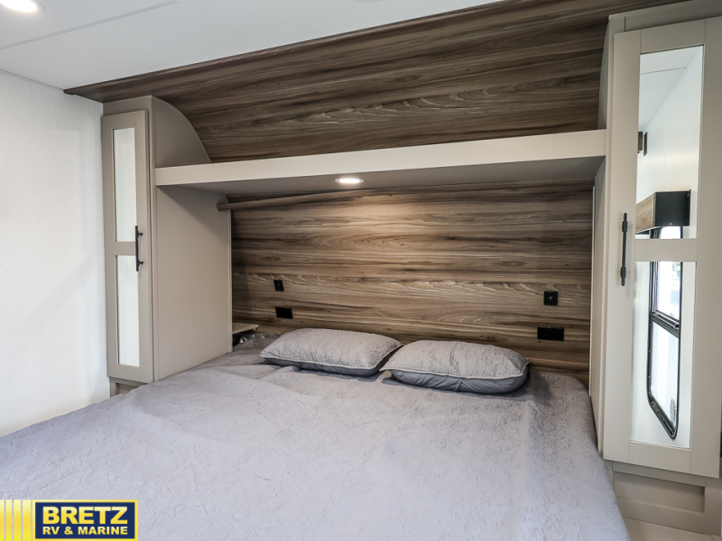 Head to your local state park in this travel trailer that can sleep eight people each night. The double-size bunks will be great for little ones, while you and your spouse take the king bed in the front private bedroom. You'll also find a U-shaped dinette within the slide for seating and sleeping space. This model includes an outside kitchen with a refrigerator and an outside griddle that will be perfect for pancakes in the morning. And don't forget to check out the storage throughout in this model, including dual shirt closets, a pantry, front pass-through storage, plus an exterior trunk door beneath the bunks for extra gear!