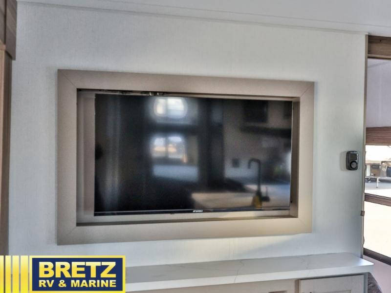 Head to your local state park in this travel trailer that can sleep 7-8 people each night. The double-size bunks will be great for little ones, while you and your spouse take the king bed in the front private bedroom. You'll also find a U-shaped dinette within the slide for seating and sleeping space. This model includes an outside kitchen with a refrigerator and an outside griddle that will be perfect for pancakes in the morning. And don't forget to check out the storage throughout in this model, including dual shirt closets, a pantry, front pass-through storage, plus an exterior trunk door beneath the bunks for extra gear!