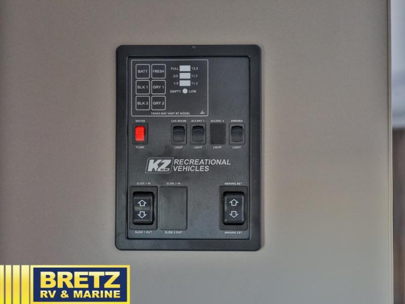 With any Confluence travel trailer by KZ you will find a white exterior fiberglass that is not only eye-catching, but easy to keep clean as well. The protective front diamond plate will help protect your trailer from rock and debris on the way to the campground, and the four stabilizer jacks will make for easy set-up once you arrive. Each model includes the Climate Package which features a heated, insulated, and enclosed underbelly with 12V heat pads and enclosed dump valves so you can camp well into the colder months. These pet-friendly models include a leash latch that will also double as a beverage opener, and there is an outside shower to fill the dogs water bowl. You will also enjoy the multi-media entertainment system with a DVD player, two 6.5" interior speakers for those rainy days. Start a new adventure today in a Confluence trailer trailer!