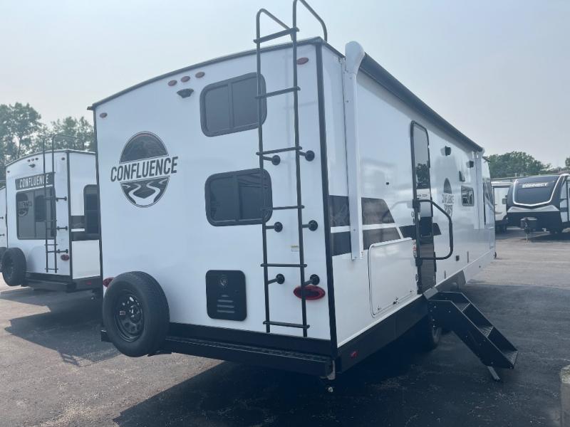 With any Confluence travel trailer by KZ you will find a white exterior fiberglass that is not only eye-catching, but easy to keep clean as well. The protective front diamond plate will help protect your trailer from rock and debris on the way to the campground, and the four stabilizer jacks will make for easy set-up once you arrive. Each model includes the Climate Package which features a heated, insulated, and enclosed underbelly with 12V heat pads and enclosed dump valves so you can camp well into the colder months. These pet-friendly models include a leash latch that will also double as a beverage opener, and there is an outside shower to fill the dogs water bowl. You will also enjoy the multi-media entertainment system with a DVD player, two 6.5" interior speakers for those rainy days. Start a new adventure today in a Confluence trailer trailer!