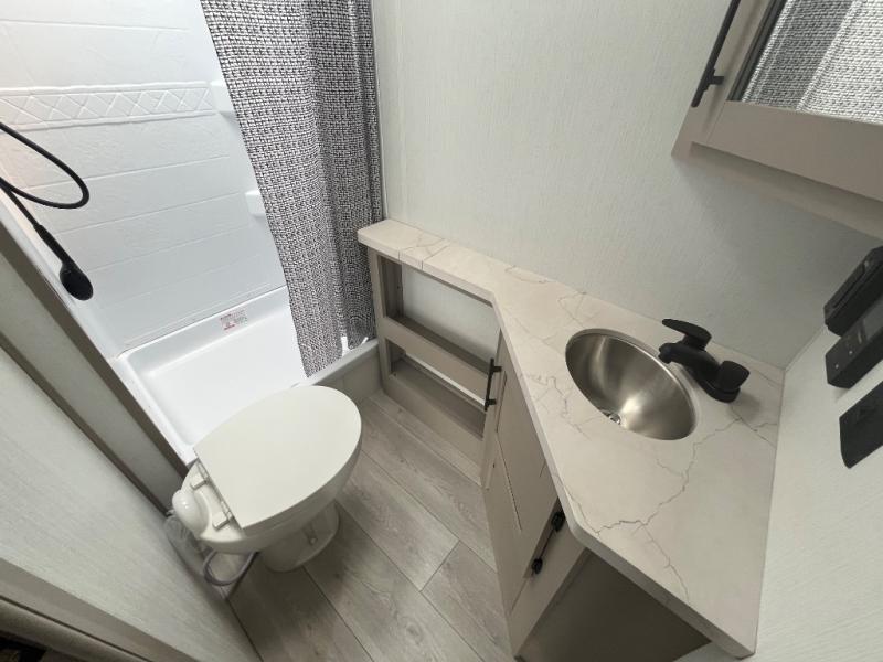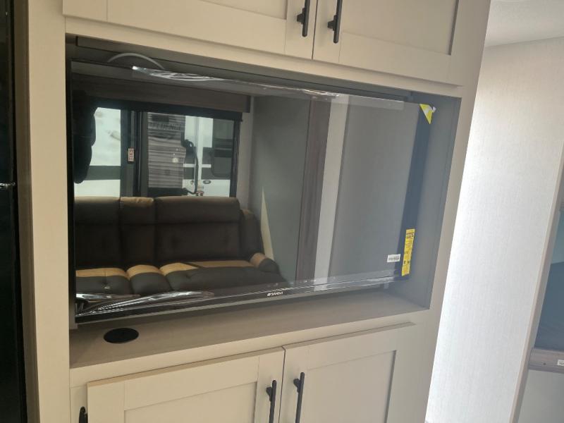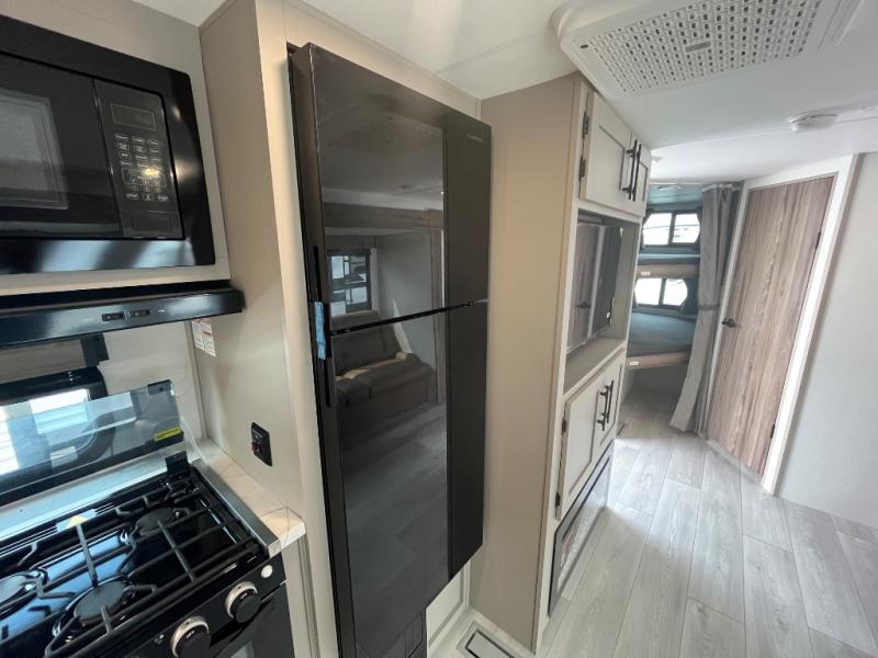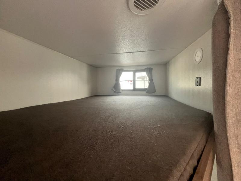 This travel trailer can comfortably sleep eight to nine people, so invite more friends to tag along! Within the large slide out you'll find the sofa and booth dinette that sits directly across from an entertainment center. You can also choose to add the optional 30" fireplace to make it more cozy. Your guests will love the double-size bunks, and the full bath is right next to the bunks to make bathroom visits at night super convenient. This model includes a three burner cooktop and a microwave oven indoors, and an outside griddle and refrigerator at the outside kitchen so you can choose where you want to cook each day. You'll appreciate the pass-through storage for fishing poles, hiking gear, and extra lawn chairs!