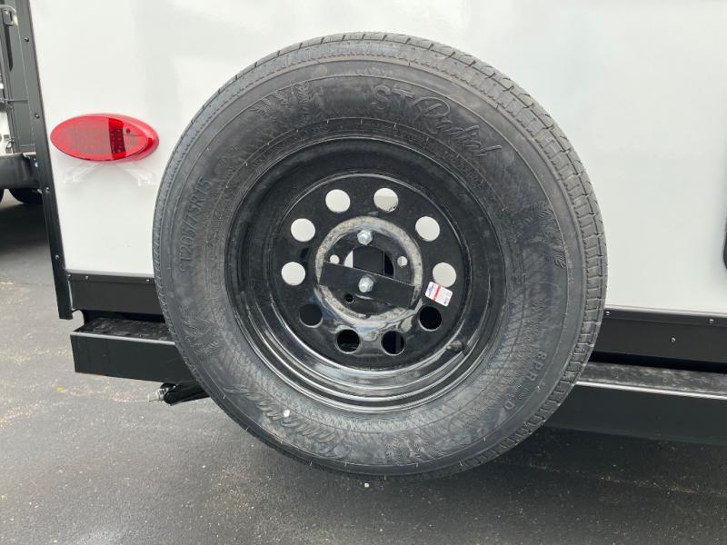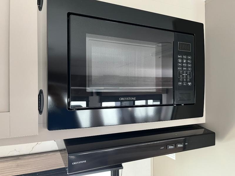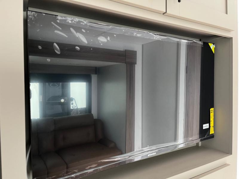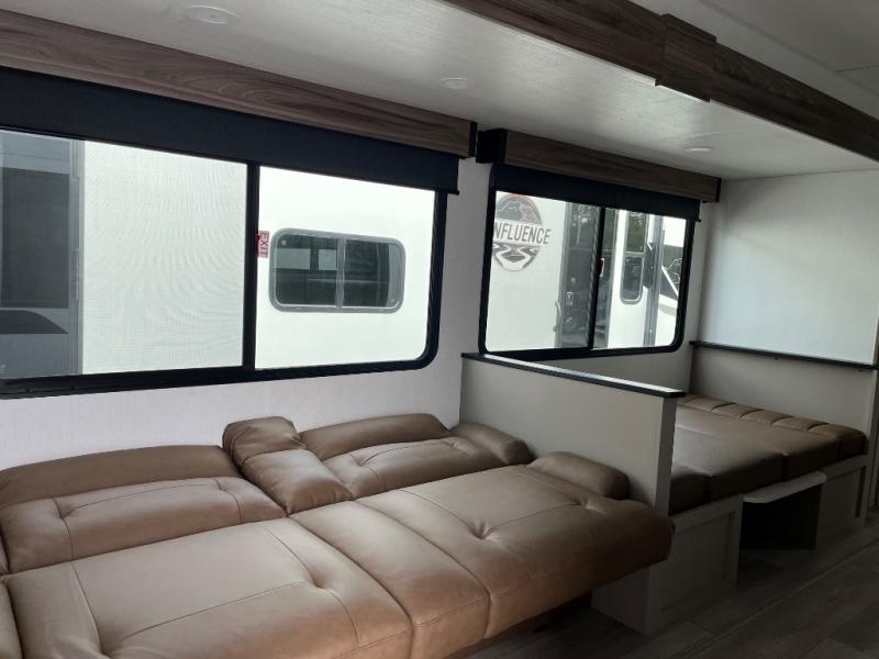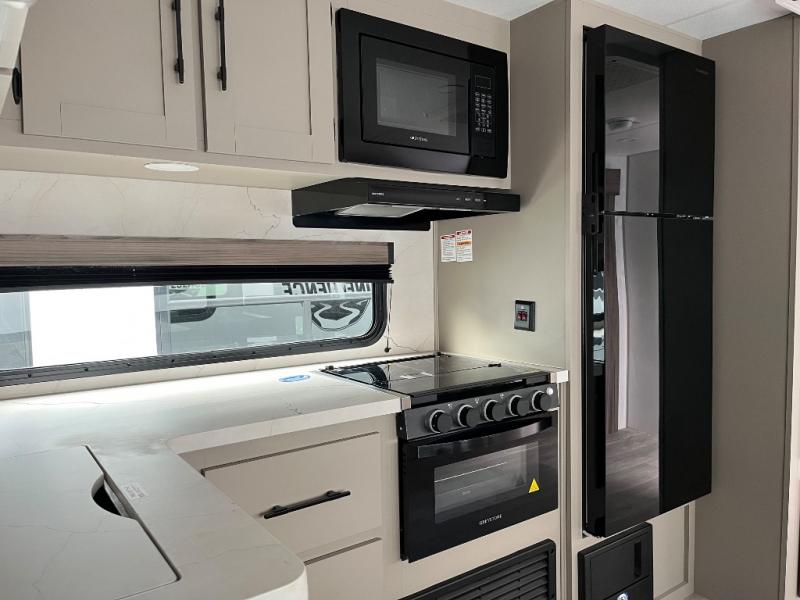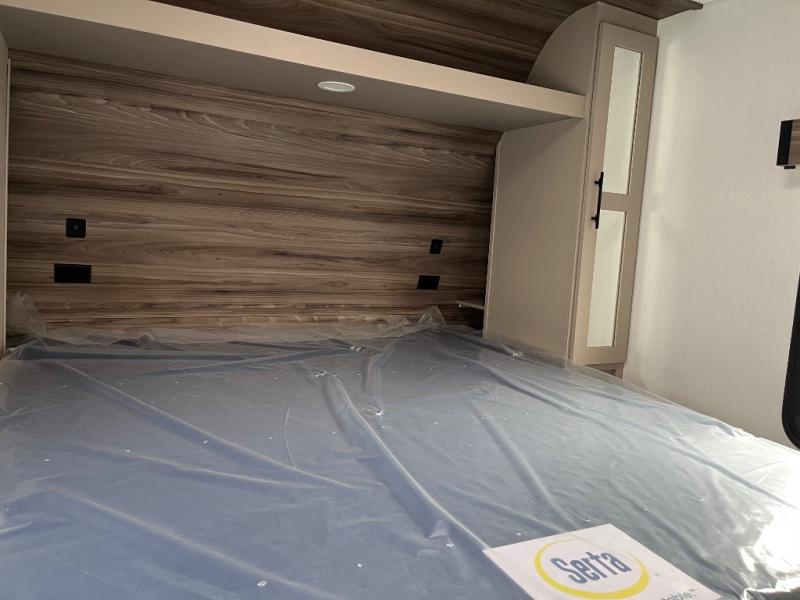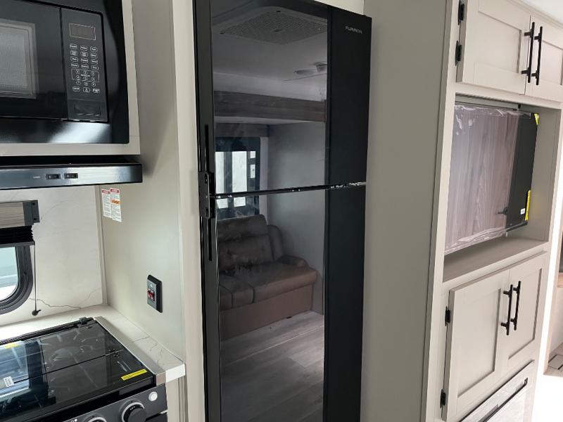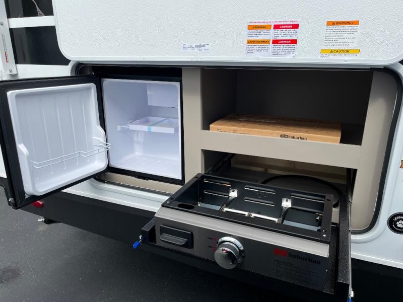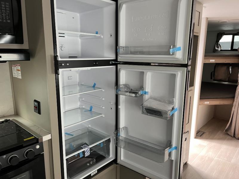 This travel trailer can comfortably sleep eight to nine people, so invite more friends to tag along! Within the large slide out you'll find the sofa and booth dinette that sits directly across from an entertainment center. You can also choose to add the optional 30" fireplace to make it more cozy. Your guests will love the double-size bunks, and the full bath is right next to the bunks to make bathroom visits at night super convenient. This model includes a three burner cooktop and a microwave oven indoors, and an outside griddle and refrigerator at the outside kitchen so you can choose where you want to cook each day. You'll appreciate the pass-through storage for fishing poles, hiking gear, and extra lawn chairs!