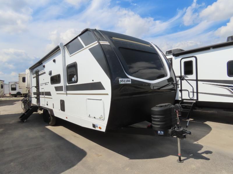 Inside, you’ll find an airy interior with an 82" ceiling height, a residential-style feel, and quality finishes. The Connect 261RB comes standard with a 40-to-cup fresh water tank, 64-gallon grey waste capacity, and dual LP tanks, giving you flexibility for longer stays. You’ll also appreciate the 10 cu ft refrigerator, 30,000 BTU furnace, and a 19' power awning for extended outdoor living.