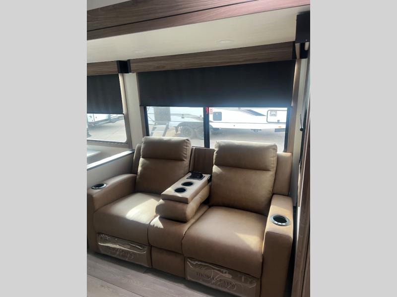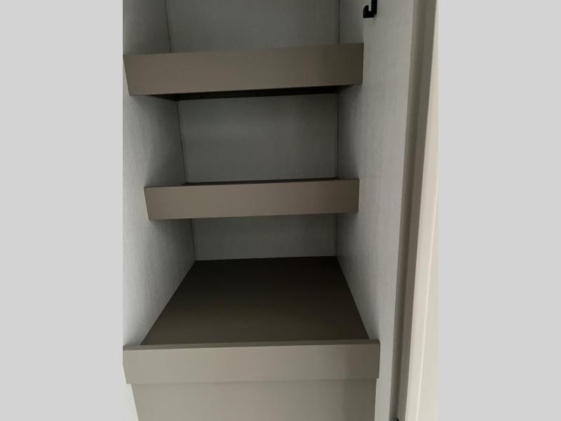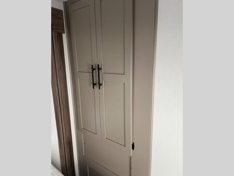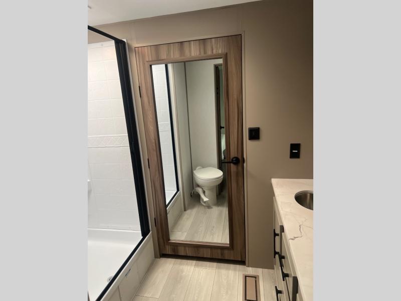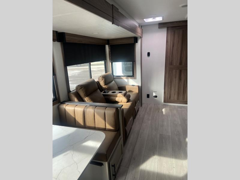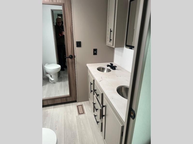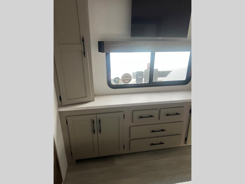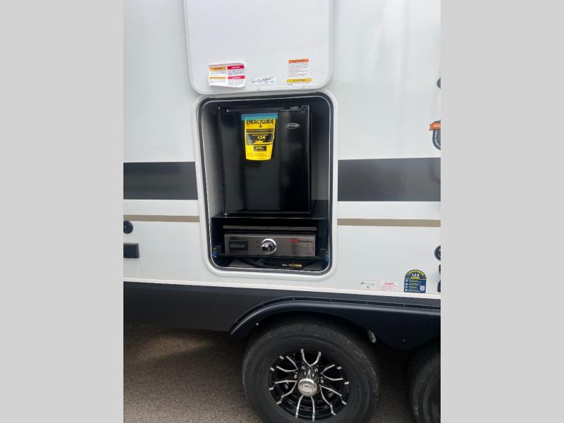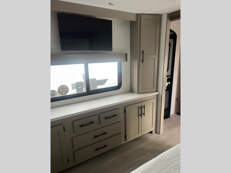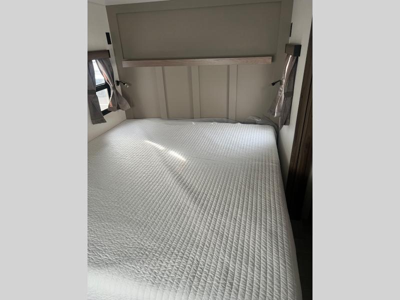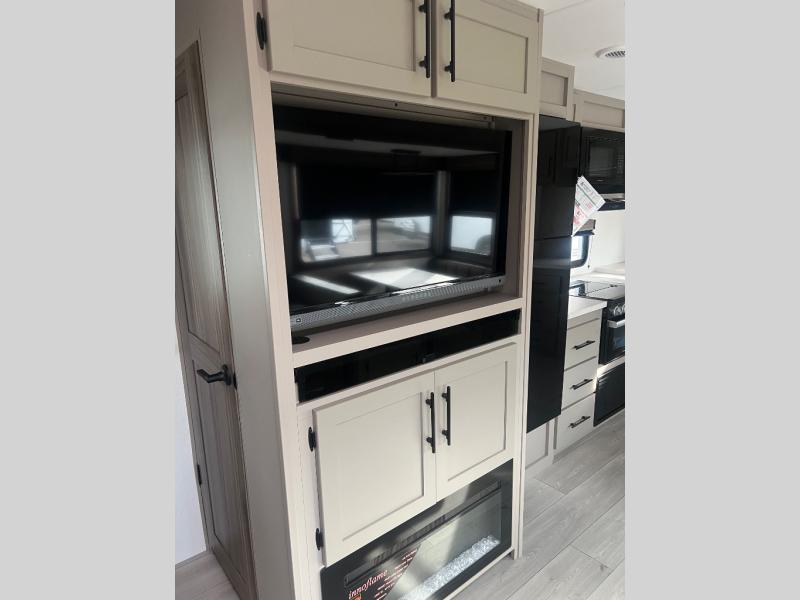 Pack your bags and head to the lake in this cozy travel trailer for five. Once you unload your gear from the pass-through storage, prepare a quick lunch on the mini outside kitchen with a griddle and relax under the patio awning. If the weather is raining on your parade, just head indoors to cook on the three burner cooktop, and you'll find ample counter space in this rear kitchen to set out drinks and sides. Your crew can relax on the hide-a-bed sofa and booth dinette within the large slide out, and there is an LED TV and a 34" fireplace for a more at-home atmosphere. One of your favorite features of this trailer will probably be the master suite with a king bed slide out, a dresser and an entertainment center, plus easy access to the front full bath. Here, you'll find dual bath sinks, a spacious shower, plus a walk-in closet with a closet rod to keep your outfits wrinkle free. There is even a wardrobe in the bedroom with washer and dryer prep so you can keep all those clothes fresh and clean!