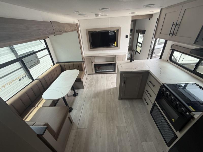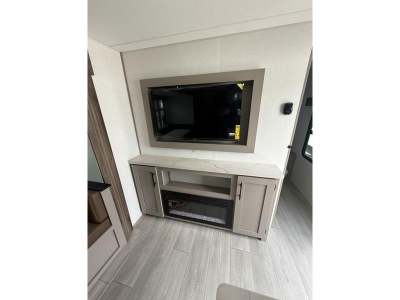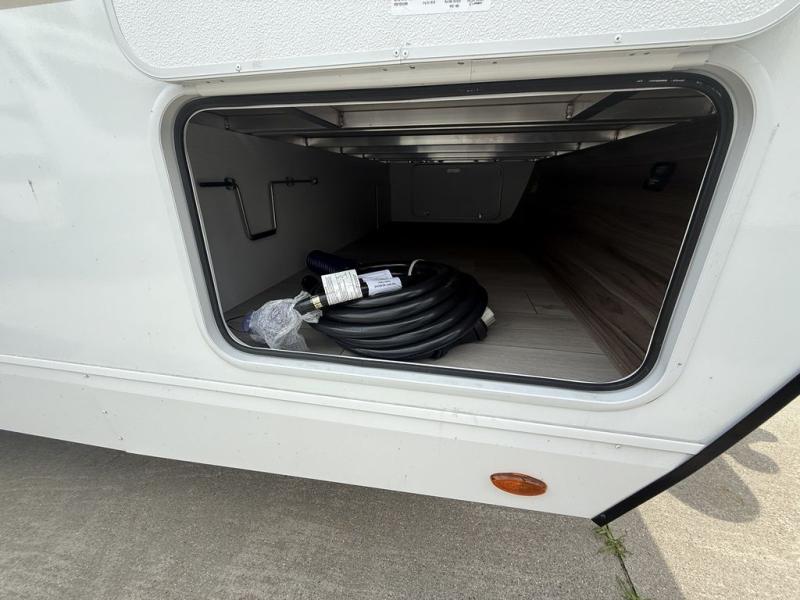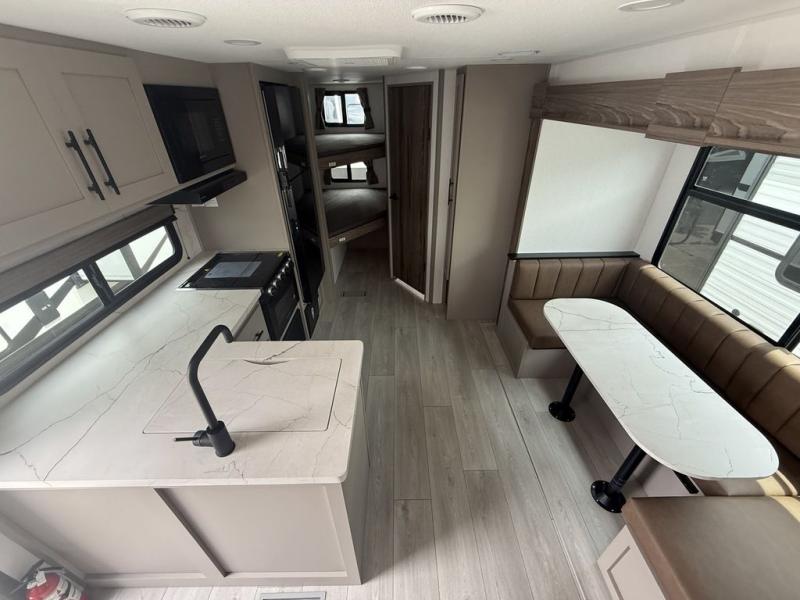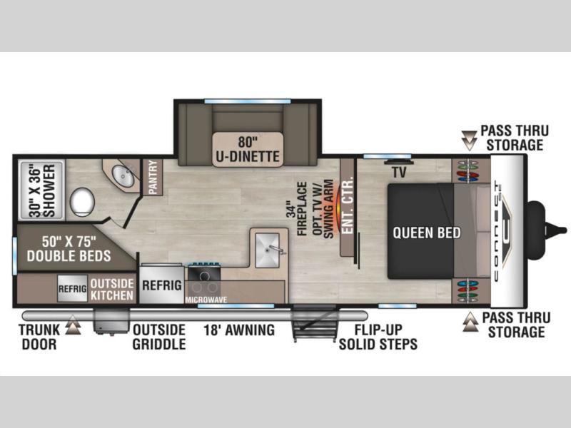 Get ready for outdoor fun at your favorite campground or RV park, and relaxation both outside and inside this trailer! The 18' power awning provides protection from the elements and the LED light strip allows you to stay up late, the outside kitchen and griddle provide amenities to make meals in the great outdoors, plus the trunk door and the pass-through storage give you access to stow items away. When you are ready to call it a night, there is a queen bed in the front private bedroom, double-size bunks next to the full bathroom, and a U-shaped dinette slide offers extra sleeping space. The next morning, the cook can make meals using the L-shaped kitchen with full amenities, or head back outdoors to use the outside amenities.